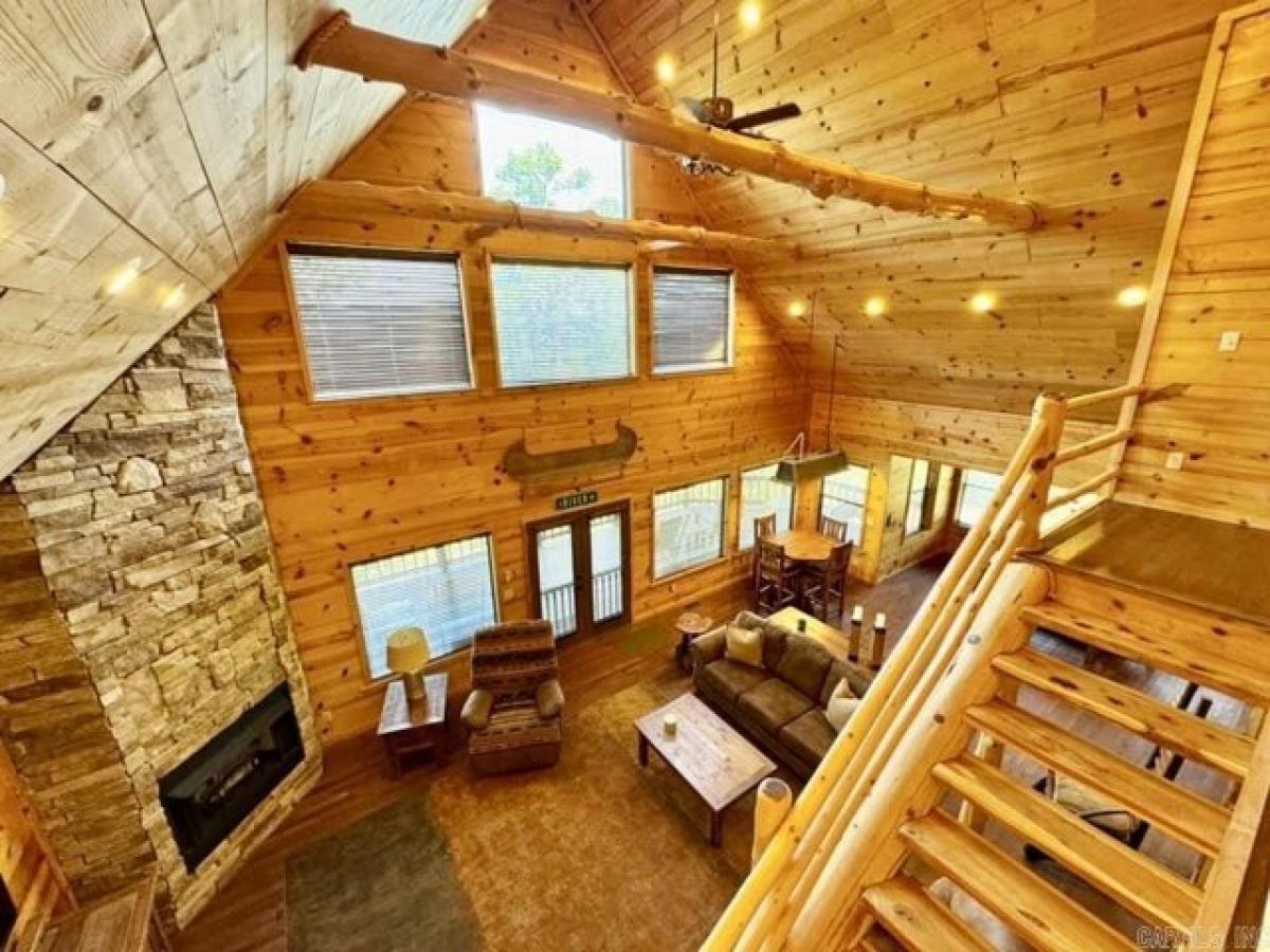 Imagine a charming log home nestled on a serene 3-acre property overlooking breathtaking Ozark Mountains. 1.5-story retreat is a perfect blend of rustic elegance and modern comfort. Large open kitchen has a large island with a gas stove top in the center. The house features 3 spacious bdrms, with one located in the open loft area, providing a cozy and airy feel. The 2.5 bathrooms are well-appointed, ensuring convenience for both residents and guests. The main bdrm and bath are on the main floor w/upstairs having 2 bdrms, one being the open loft and a full bath. A large, back deck at the rear of the house offers an inviting space for relaxation or entertainment, furnished w/sturdy, handcrafted wood furniture that complements the natural surroundings. Front porch, also generously furnished w/wood pieces, provides a warm welcome and a perfect spot to enjoy the panoramic views of the Ozark Mountains. The entire home exudes a cozy, rustic charm, enhanced by the natural beauty of its surroundings. Whether you're sipping coffee on the porch or enjoying a sunset on the deck, this log home offers a peaceful, idyllic retreat with stunning mountain vistas stretching for miles. Furnishings ConveyFor more details:
