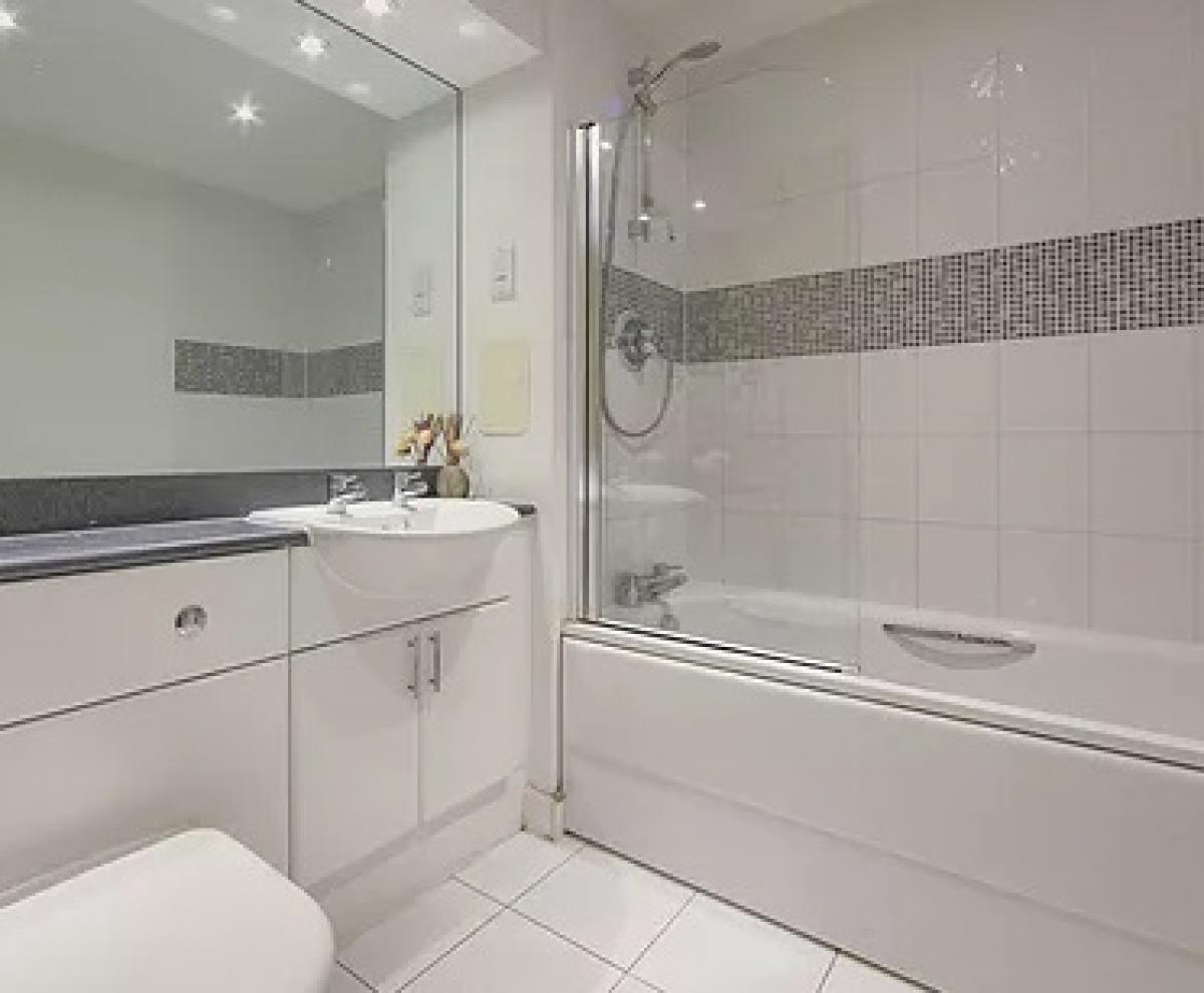Bathroom - Modern fitted suite comprising; panelled bath with overhead shower attachment with glass screen, WC and wash hand basin.