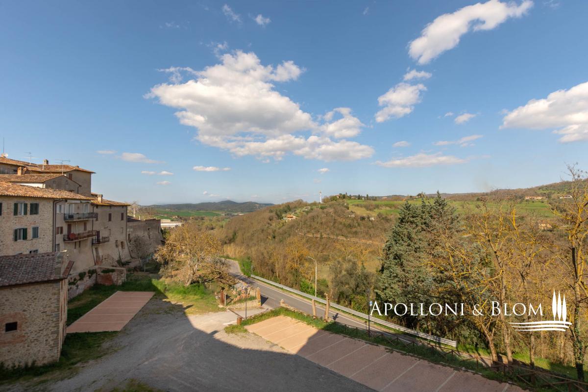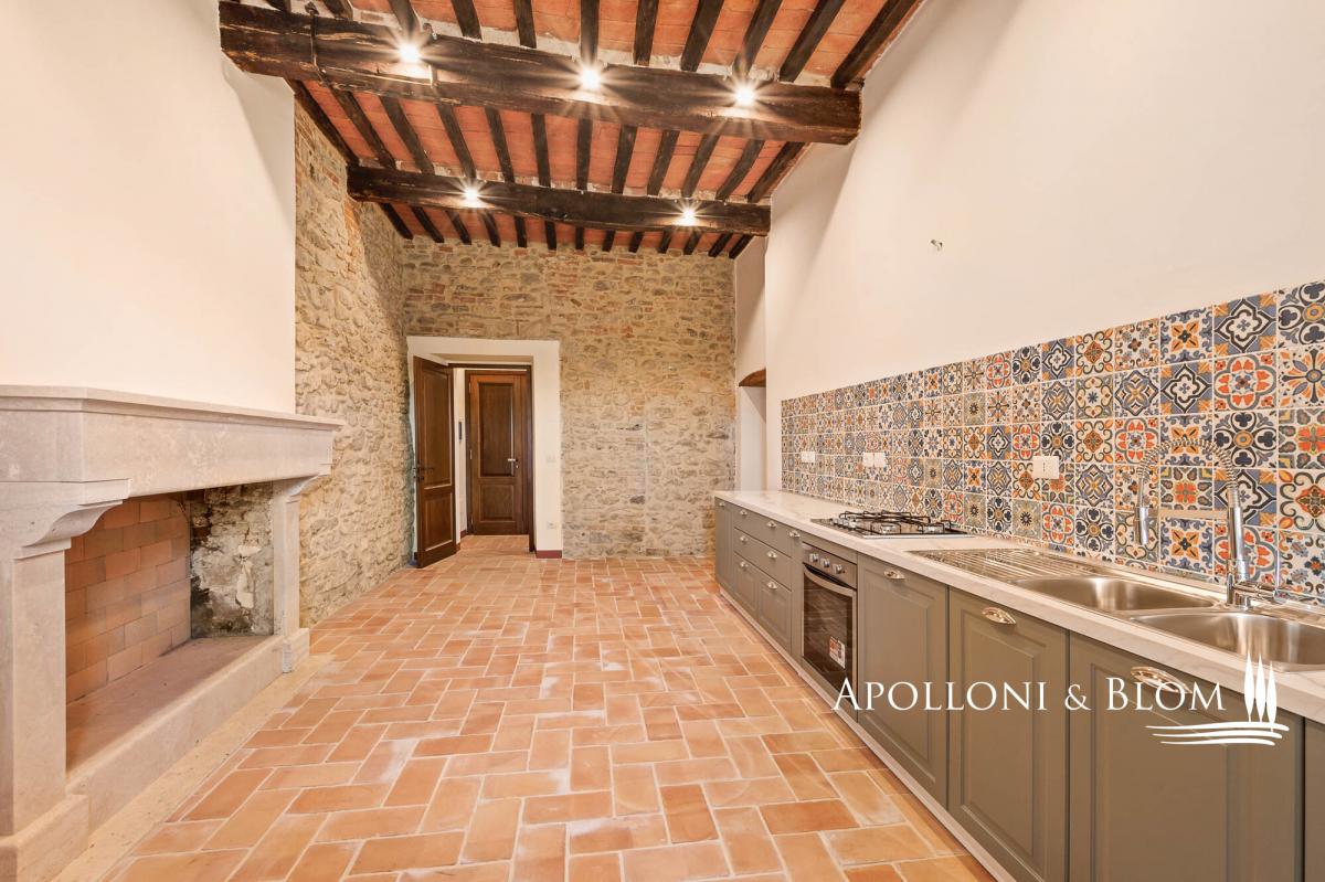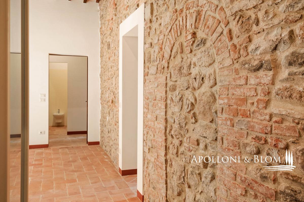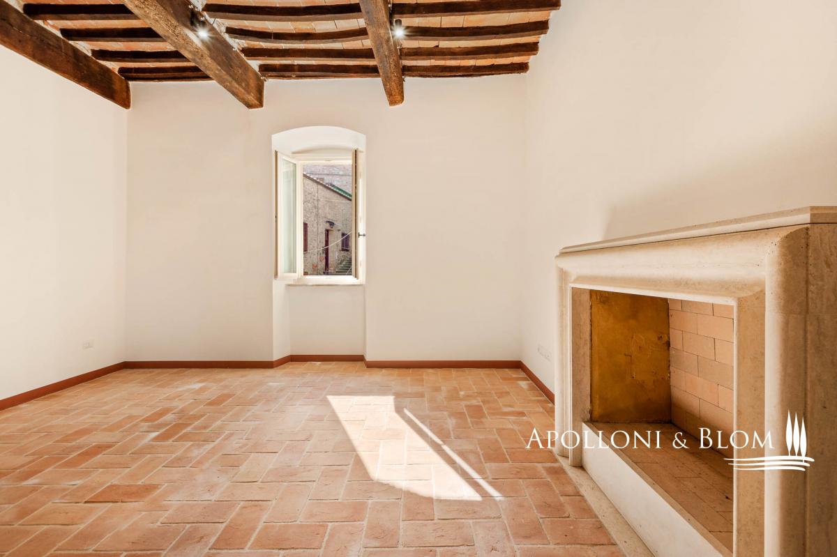 Two-story apartment in historic building, double entrance, stone walls for sale in the medieval borgo of Piegaro. In the heart of the medieval town of Piegaro, unique opportunity to purchase an historical townhouse spreading 211 square meters (2271 sq ft) on two levels, starring two single entrances and the typical rustic style combined with an atmosphere rich in history and charm. All rooms offer unique character, stone walls, fireplace, terracotta floors, wooden beam ceilings. One entrance from the ground floor opens into a rustic room with a staircase to a first-floor apartment. Here the entire living area has recently been renovated and comprises a central hallway leading to a eat-in kitchen, a sitting room with fireplace, two double bedrooms, two bathrooms and a laundry room. Newly installed double glazed windows, central heating with radiators, bathrooms with new fittings and free-standing showers are just some of the amenities that are included. From the windows, there is an open view of the rooftops of Piegaro and the surrounding countryside. The ground floor is completed by a 34 square meters (365 sq ft) rustic room featuring a single separate entrance, a toilet, a back room for storage and deposit, an area perfect for a tavern or studio flat. Situated on the road connecting Lake Trasimeno to Città della Pieve, the historic center of Piegaro dates back to the Middle Ages and retains its stone palaces, cobbled streets and traditional town houses. The nearby River Nestore flows through an exceptionally unspoilt area, where natural paths through woods and rolling hills lead to the nearby Lake Pietrafitta. The border with Tuscany and the shores of Lake Trasimeno are both just a 20-minute drive away, making it a strategic location for sightseeing and discovering the gems of central Italy. PROPERTY Ref: PIE3087_1 Location: Piegaro, Provincia: Perugia, Regione: Umbria Type: 211 sq m/2271 sq ft two-story house with rustic ground floor Year of construction: 1600 Year of restoration: 2024 the first floor Conditions: excellent the first floor, partly to be upgraded the ground floor Utilities: Fixed telephone network: available Internet: available Heating: methane Water: mains city supply Electricity: available Distance from services: walking distance Distance from main airports: Perugia 46km, Roma 180km Layout: Ground Floor: 79 sq m/850 sq ft with single entrance into a rustic room with staircase, 1 toilet/WC with window, 1 storage room; a 34 sq m/365 sq ft rustic room/tavern with independent entrance First Floor: Apartment 1 of 98 sq m/1054 sq ft, fully renovated, including hallway/corridor, 1 kitchen, 1 living room with fireplace, 2 bedrooms, 2 bathrooms, and 1 laundry room.- bathroom