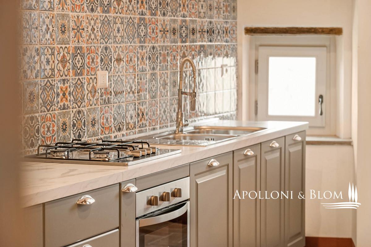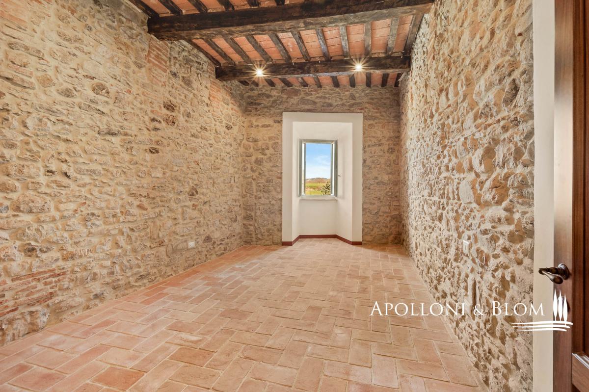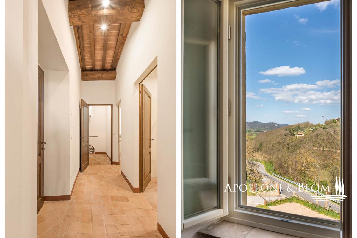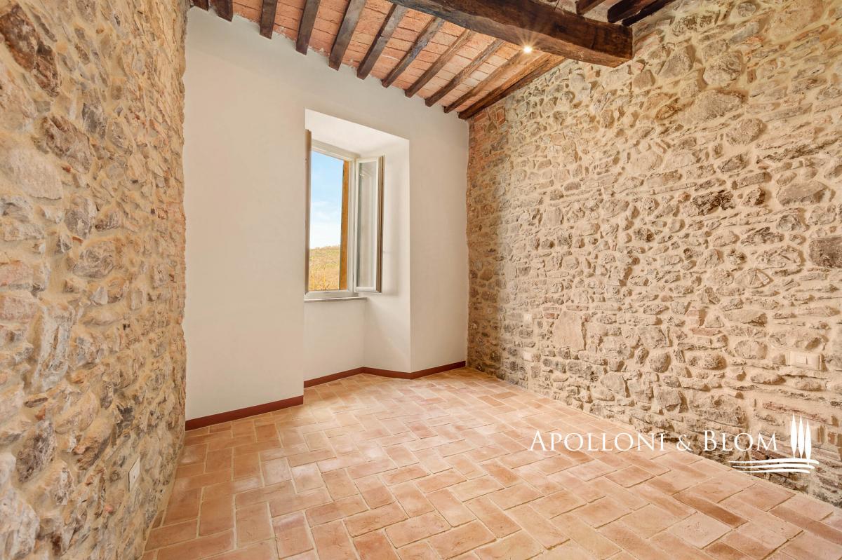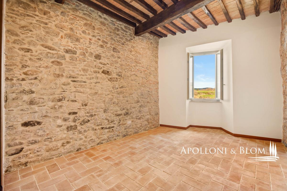 Two-story apartment in historic building, double entrance, stone walls for sale in the medieval borgo of Piegaro. In the heart of the medieval town of Piegaro, unique opportunity to purchase an historical townhouse spreading 211 square meters (2271 sq ft) on two levels, starring two single entrances and the typical rustic style combined with an atmosphere rich in history and charm. All rooms offer unique character, stone walls, fireplace, terracotta floors, wooden beam ceilings. One entrance from the ground floor opens into a rustic room with a staircase to a first-floor apartment. Here the entire living area has recently been renovated and comprises a central hallway leading to a eat-in kitchen, a sitting room with fireplace, two double bedrooms, two bathrooms and a laundry room. Newly installed double glazed windows, central heating with radiators, bathrooms with new fittings and free-standing showers are just some of the amenities that are included. From the windows, there is an open view of the rooftops of Piegaro and the surrounding countryside. The ground floor is completed by a 34 square meters (365 sq ft) rustic room featuring a single separate entrance, a toilet, a back room for storage and deposit, an area perfect for a tavern or studio flat. Situated on the road connecting Lake Trasimeno to Città della Pieve, the historic center of Piegaro dates back to the Middle Ages and retains its stone palaces, cobbled streets and traditional town houses. The nearby River Nestore flows through an exceptionally unspoilt area, where natural paths through woods and rolling hills lead to the nearby Lake Pietrafitta. The border with Tuscany and the shores of Lake Trasimeno are both just a 20-minute drive away, making it a strategic location for sightseeing and discovering the gems of central Italy. PROPERTY Ref: PIE3087_1 Location: Piegaro, Provincia: Perugia, Regione: Umbria Type: 211 sq m/2271 sq ft two-story house with rustic ground floor Year of construction: 1600 Year of restoration: 2024 the first floor Conditions: excellent the first floor, partly to be upgraded the ground floor Utilities: Fixed telephone network: available Internet: available Heating: methane Water: mains city supply Electricity: available Distance from services: walking distance Distance from main airports: Perugia 46km, Roma 180km Layout: Ground Floor: 79 sq m/850 sq ft with single entrance into a rustic room with staircase, 1 toilet/WC with window, 1 storage room; a 34 sq m/365 sq ft rustic room/tavern with independent entrance First Floor: Apartment 1 of 98 sq m/1054 sq ft, fully renovated, including hallway/corridor, 1 kitchen, 1 living room with fireplace, 2 bedrooms, 2 bathrooms, and 1 laundry room.- bathroom