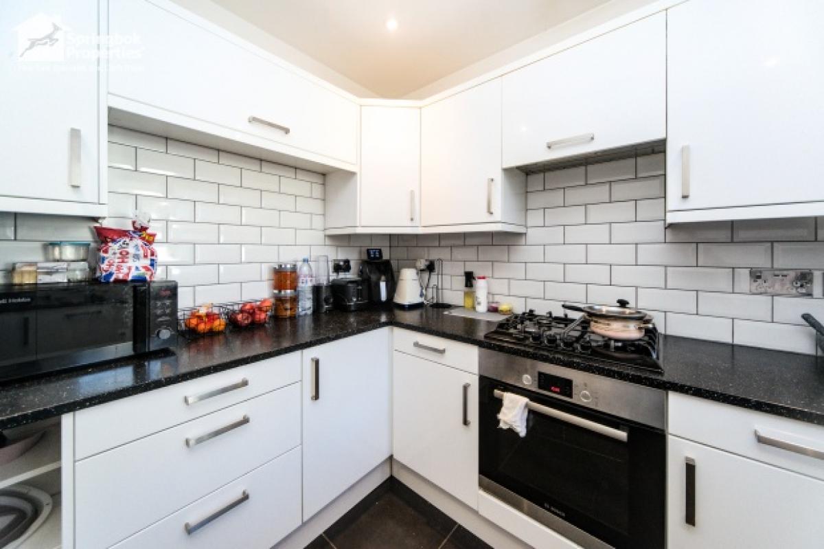 The adjoining kitchen is neatly fitted with modern units and integrated appliances, providing a practical and well-organised cooking space that connects easily with the rest of the home. A large double room offers flexibility for additional seating or workspace alongside sleeping arrangements, while the bathroom is finished with contemporary tiling and a white suite, including a bath with shower over.