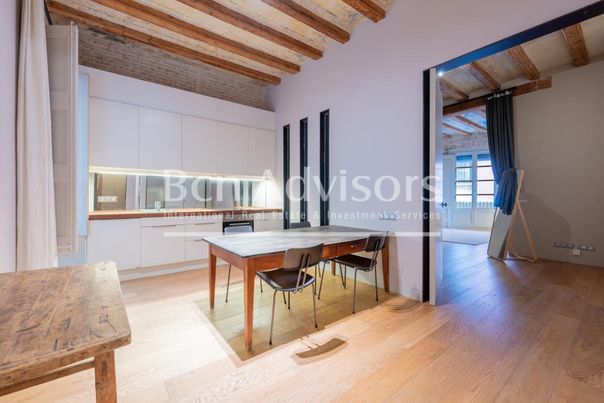 This cosy flat is located in an unbeatable area in the heart of Barcelona, just a few steps from Plaza Catalunya and La Rambla. It's an ideal option both for those who want to settle in the city centre and for those looking for a safe investment in an area with high rental demand.The property has 74 built interior sqm and is located on the real second floor of a building with a lift between floors. It was renovated in 2013 and retains original architectural features that enhance its charm, such as high ceilings with Catalan vaults, exposed wooden beams, original woodwork and classic skirting boards.