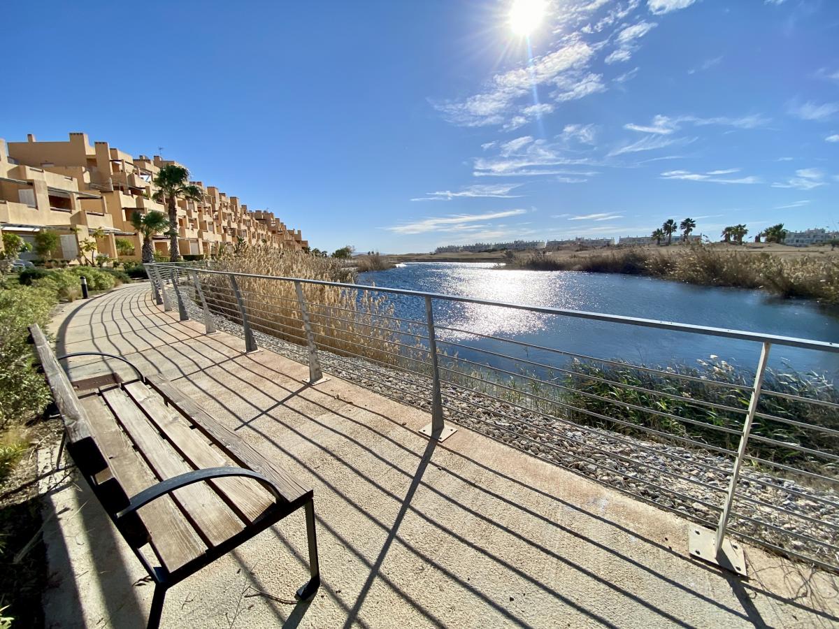 Located on the popular Las Terrazas De La Torre Golf Resort, this ground floor apartment is situated in the sought after area of La Isla (The Island). Surrounded by a beautiful lake with 2 waterfront communal swimming pools and convenient parking, it is just a stones throw away from the resorts supermarket where you can pick up freshly baked bread, the Clubhouse bar/restaurant and the Pro Shop.The apartment has very good access with designated parking right outside. Entering the apartment, you are instantly met with an open plan living area which has stunning waterfront views. The kitchen is open plan and has plenty of storage and worktop space. The dining and living room opens on to a spacious terrace and private garden which leads directly on to a beautiful walk way that guides you to the swimming pools and has seating to enjoy the lake and golf views.