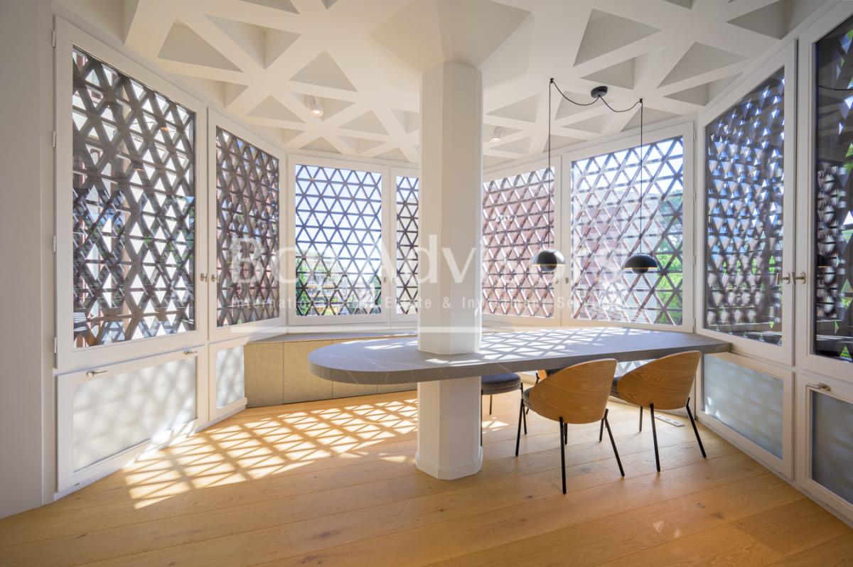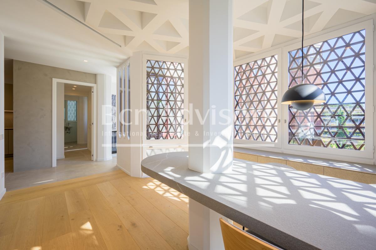 This unique and exclusive upscale property is located in a privileged location next to the Cruz de Pedralbes, one of the most prestigious areas of Barcelona. It has 259,37 built interior sqm and a 14 sqm terrace.The flat is situated in an extraordinary building, catalogued as part of our valuable cultural heritage in the city of Barcelona. Its hexagonal design, with elegant natural wood lattices and large windows, is truly distinctive. In addition, the property has a charming garden and a communal swimming pool. The price includes 3 parking spaces, 2 of them inside the building and one more outside.