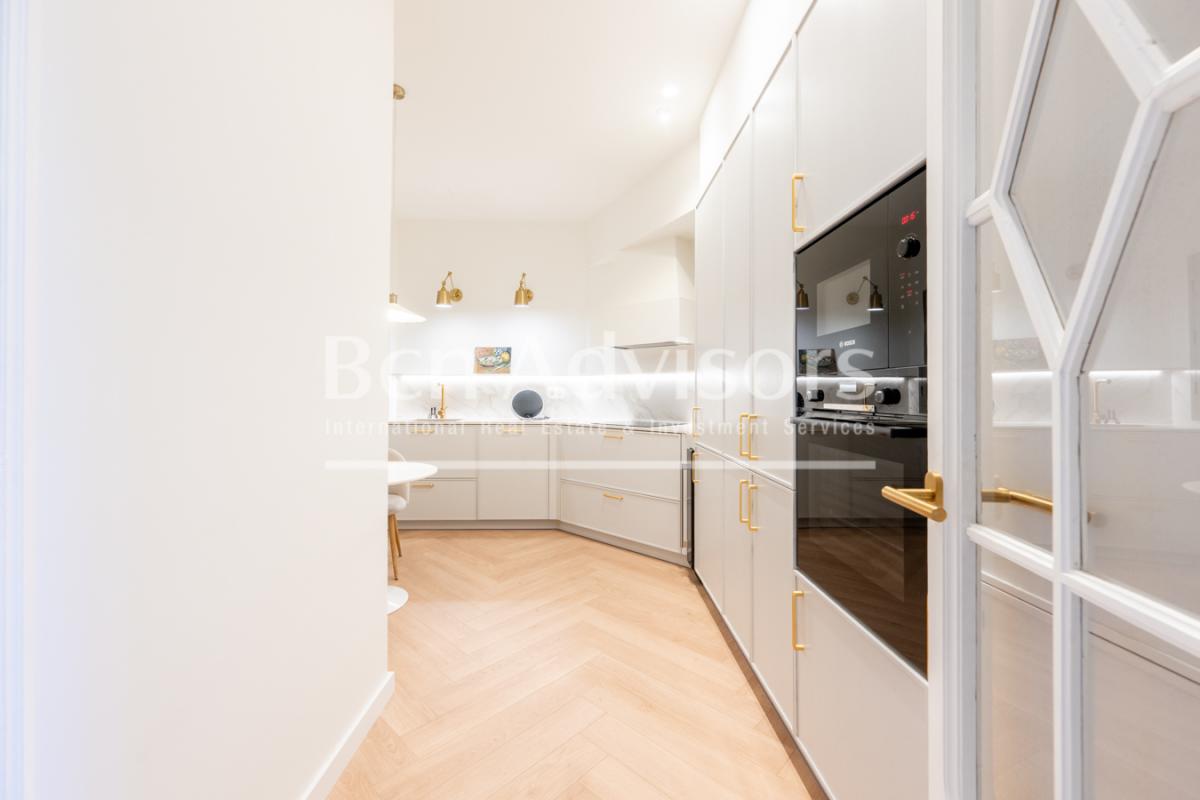 Inside, the apartment radiates light, balance, and elegance. Every space has been designed to offer everyday comfort without sacrificing classic charm. The living-dining room is spacious and filled with natural light, featuring two balconies overlooking the street. The kitchen, equipped with high-end appliances, blends functionality and design — ideal for daily living or for entertaining friends and family.