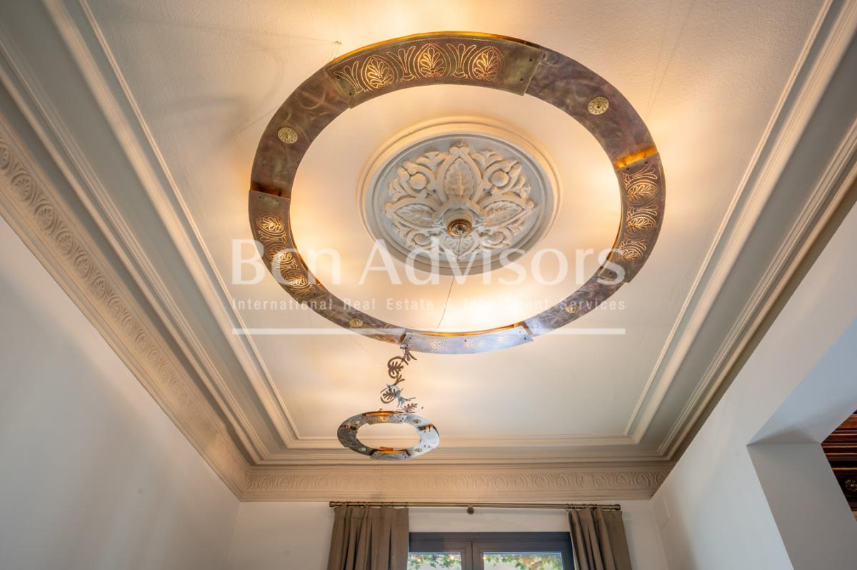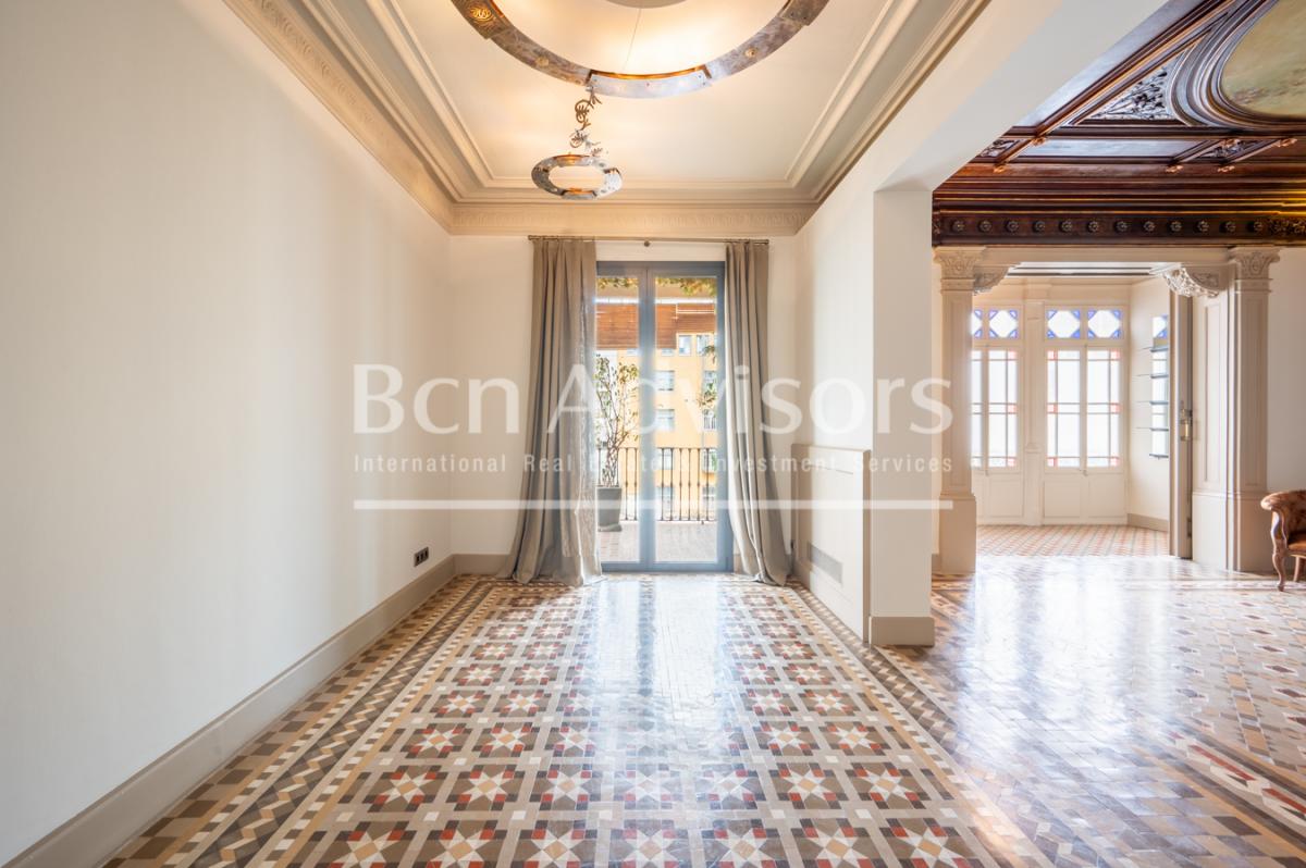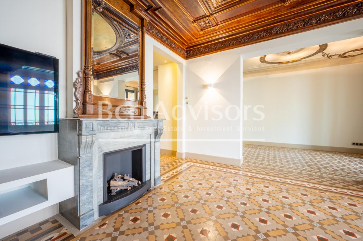 In the heart of the Eixample district, this exclusive 202 m2 flat has been completely renovated with an exquisite refurbishment project that has preserved its original modernist essence. The property retains unique features of great heritage value, such as Nolla hydraulic mosaic floors, high ceilings decorated with delicate floral and geometric motifs, restored woodwork, ornate windows and an elegant marble fireplace that adds character and distinction to the main area.A spacious and stately entrance hall welcomes you and organises the home in a functional way, clearly differentiating the day and night areas. The social area consists of a generous living room filled with natural light, connected to a pleasant gallery and opening onto a balcony facing a quiet courtyard, an ideal space to enjoy the calm in the heart of the city.