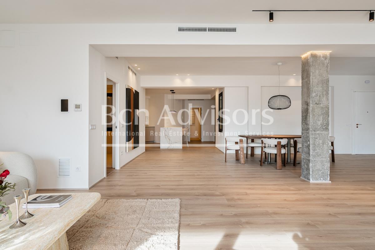 This spectacular property, featuring a luxury renovation, offers an ample interior built area of 290 sqm and two terraces totaling 28 sqm. It is located in the upper part of Eixample's right side, just steps from Avinguda Diagonal and Passeig de Sant Joan, and close to Passeig de Gracia as well as the neighbourhoods of Gracia and La Sagrada Familia.The apartment is situated on the fifth floor of a classic chamfered building. It has two entrances. The day area is an impressive space that integrates the living-dining room, an open kitchen with a central island, an office area with a wine cellar and a storage room. The entire space enjoys outstanding natural light thanks to its excellent south-facing orientation. The living-dining room opens onto a pleasant terrace with wonderful city views, the perfect place to have a drink, enjoy breakfast or lunch, spend time with your loved ones, or simply relax.