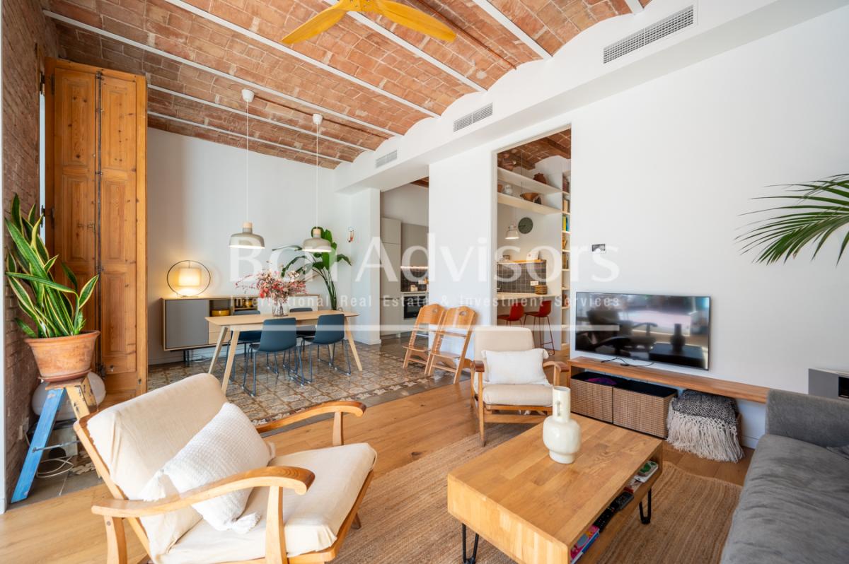 This beautiful apartment, renovated in 2023, is located in the best area of Vila de Gracia neighbourhood. The renovation, of the highest standard and energy efficiency, maintained and enhanced the original features, such as Catalan vaulted ceilings, hydraulic floors, exposed brick walls and woodwork. This is a spectacular property that also offers a large 70 sqm terrace for you to enjoy the outdoors as you wish.This flat has 140 built interior sqm. The living area is a spacious space that integrates the living room, dining room, open kitchen (with a separate pantry opposite) and a beautiful gallery that opens onto the wonderful 70 m2 terrace, which includes a storage room and laundry room. It is very sunny due to its perfect south-east orientation and the fact that the surrounding buildings are low. It is also quiet because it overlooks the inner courtyard. You will undoubtedly want to spend time here meeting friends and family, eating outdoors or simply relaxing in Barcelona's pleasant Mediterranean climate.