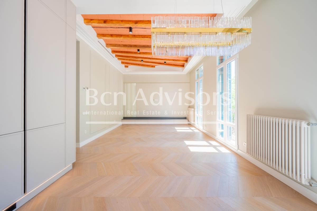 This brand new refurbished 130 sqm 3-bedroom flat enjoys an enviable location in the upper part of the Eixample's right side, next to Paseo Sant Joan and Avenida Diagonal. It's located on the real 2nd floor of a regal estate building on a corner, making it very bright and offering clear views of the city.A large entrance hall with wardrobe welcomes us to the flat. On the left hand side we access the fantastic living-dining room with integrated kitchen. It's a space full of natural light, with 3 large windows and 2 balconies with views to the Paseo Sant Joan.