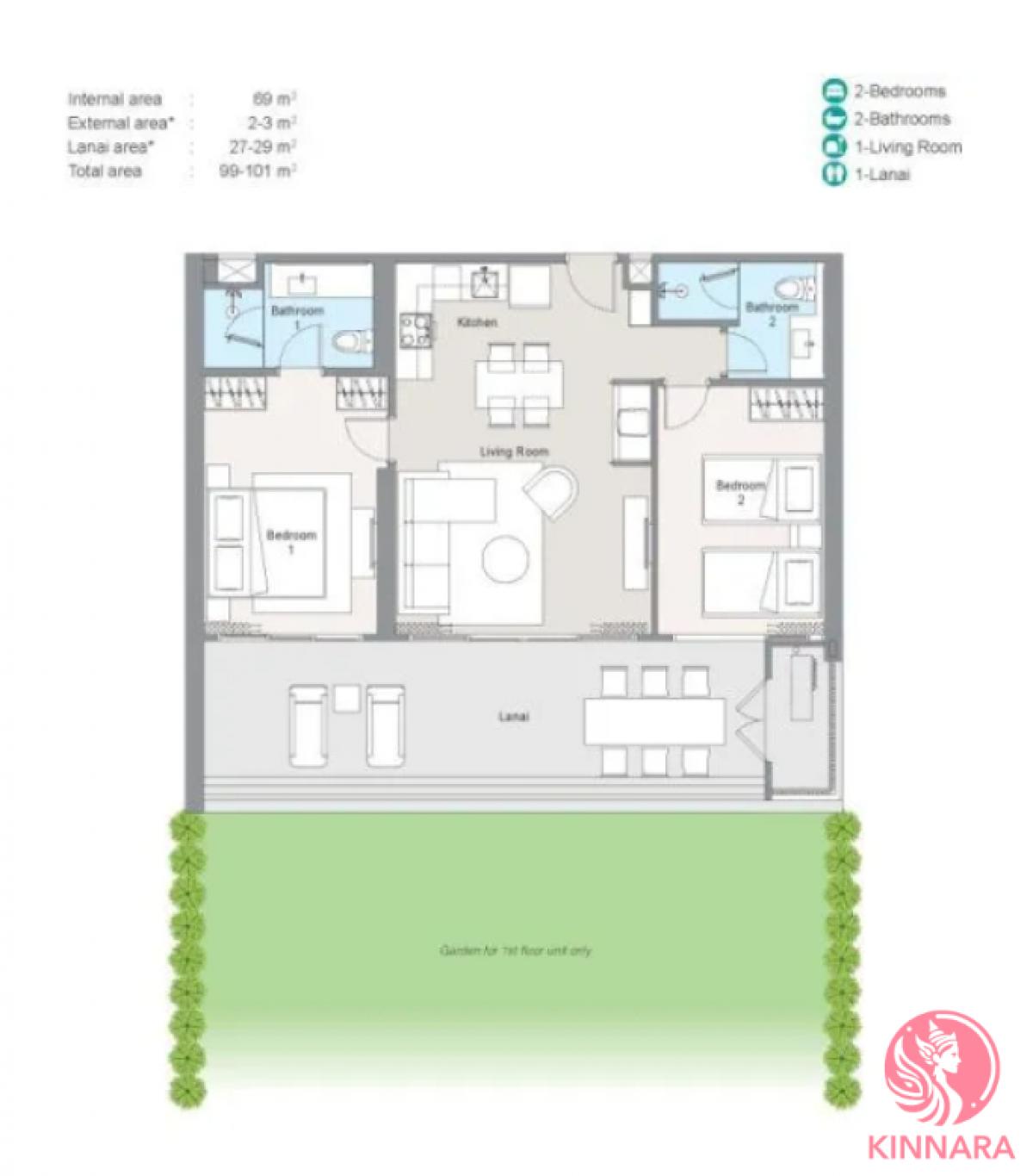Laguna Seaside Residences Type 2BR (Coastal Garden)Nestled in the prestigious Laguna area of Phuket, Laguna Seaside Residences offer a rare opportunity to experience luxury living at its finest. This exclusive development redefines sophistication with its exquisite selection of spacious units boasting stunning sea views overlooking the pristine Bangtao Beach and lush tropical gardens. With only 49 meticulously designed condominium units available for sale, Laguna Seaside Residences cater to discerning buyers seeking a low-density, opulent residential haven. Choose from a range of floor plans, including cozy 1-bedroom residences spanning 60 square meters, generous 2-bedroom abodes measuring 99 square meters, or expansive 3-bedroom sanctuaries spanning 131 square meters. Residents of Laguna Seaside Residences are treated to an unparalleled lifestyle. The rooftop is the epitome of luxury living, offering breathtaking sea views and state-of-the-art facilities. The 2-bedroom and 3-bedroom units feature a charming Lanai area, a semi-outdoor space that seamlessly merges indoor and outdoor living. Enhance your Lanai with an air conditioning system, sliding glass panel, and insect screen to create a versatile space for relaxing and entertaining in style. Experience the best that Phuket has to offer at Laguna Seaside Residences where luxury meets tranquility amidst a backdrop of natural beauty.