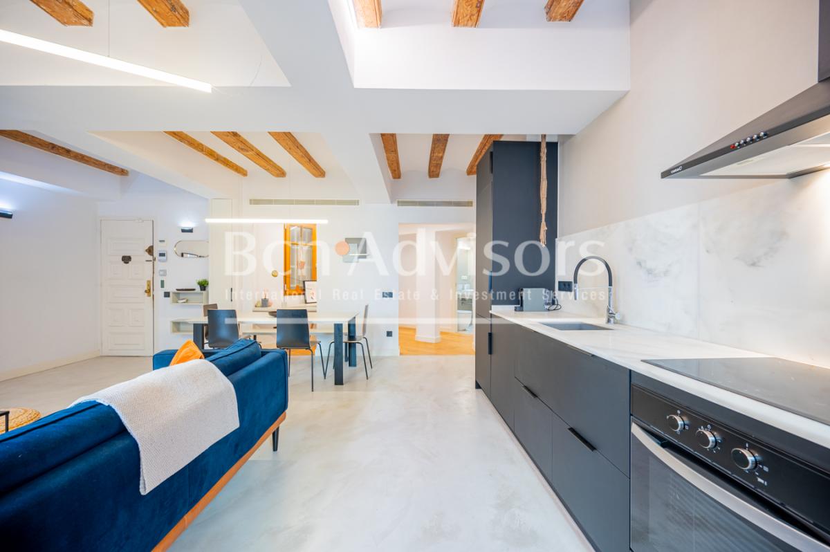 This refurbished flat of 88 built sqm with 2 bedrooms is located in the very centre of Barcelona, on a street parallel to Pelai and a few steps from Plaza Catalunya, La Rambla and Plaza Universitat. It's in a building from the early 19th century with great architectural and historical value, just like the environment in which it is located, close to important spaces of local cultural interest and of international recognition.This property, refurbished in 2019, is on the real third floor and the building has a lift. It stands out for its modern and simple lines with traditional details of its original construction such as high ceilings, wooden beams and large windows, as well as some restored original brick walls.