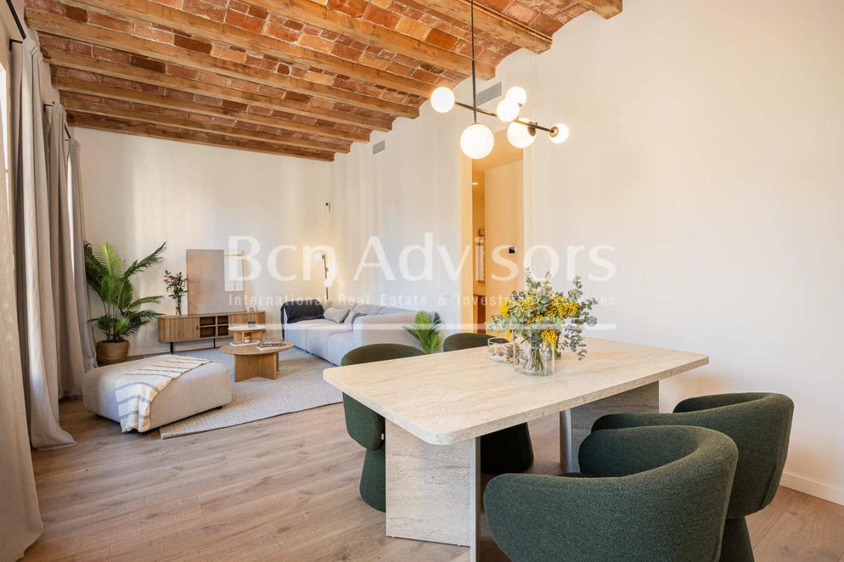 The flat will be handed over furnished. The renovation will retain the original features of the flat, such as the Catalan vaulted ceilings. Its design stands out for its spaciousness and abundant natural light, creating a warm and functional atmosphere. The flat will be equipped with parquet flooring, air conditioning and heating. The building has a lift.