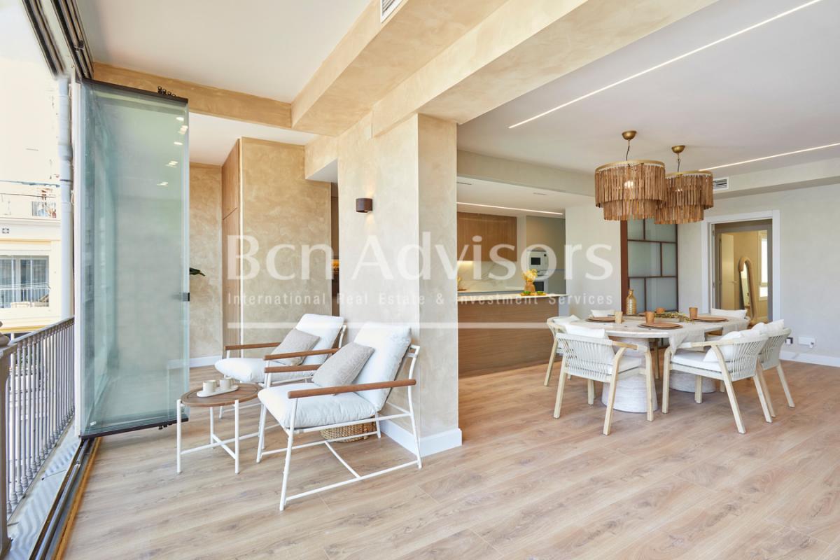This excellent brand new flat of 188 sqm and 4 bedrooms with a luxury refurbishment is located in a regal building in the Quadrat d'Or of the Eixample. It is 4 streets away from Paseo de Gracia, very close to the city centre, Paseo Sant Joan and the Born district, one of the most sought-after locations in Barcelona.The large living-dining room is incredibly bright and quiet, as it overlooks the west-facing courtyard. It has a spectacular gallery area with large windows that can be stacked to one side and create a very interesting effect of spaciousness, connecting the interior of the day area with the exterior. It has a terrace measuring approximately 18 m2, which could be restored as such. The kitchen with central island is open to the living room but can be closed off with sliding doors to differentiate the two spaces.