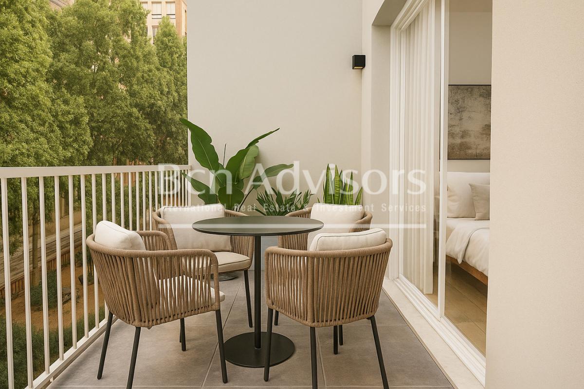 The living area has a spacious 21 sqm living-dining room, which is very pleasant and has direct access to the terrace overlooking the street. It is an ideal space for outdoor breakfasts, working from home or creating a chill-out corner surrounded by greenery. The semi-open kitchen, fully equipped with appliances, offers a comfortable and practical space for everyday use.