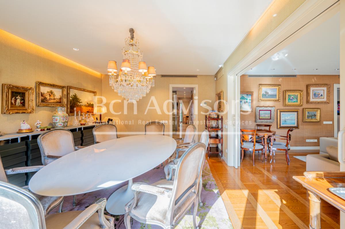 This exceptional, high-end property has been renovated to the highest standard and occupies the entire second floor of the building, with a total interior floor space of 400 m2. This is an exceptional opportunity to enjoy a life of luxury in one of the best residential areas in uptown Barcelona, the Les Tres Torres neighbourhood. Living in this flat is like living in a house, but with an excellent quality of life and without the problems of insecurity and distance from the city centre.Being completely exterior, the entire flat is extremely bright, creating a unique, cosy feeling of peace and well-being. The day area is a grand space divided into three wonderful rooms: living room, dining room and kitchen, where you can enjoy everyday life in maximum comfort. There is also a separate laundry room with a clothesline.