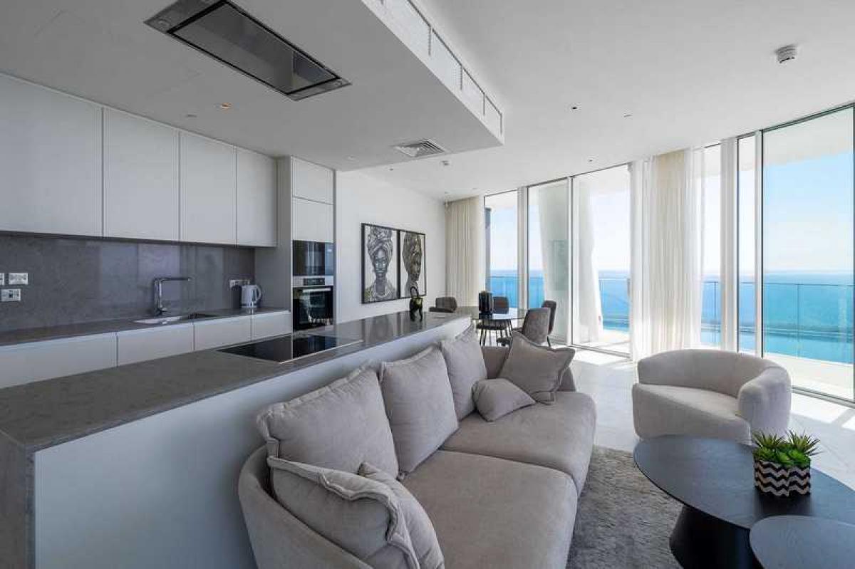 Each apartment has a unique layout, strategically designed to ensure that all living spaces, including bedrooms, face the captivating waterfront and pristine beaches. Modern open-plan designs dominate, maximizing both daylight and breathtaking views. The living rooms feature full-height glass doors that seamlessly open, extending the living area onto the covered veranda.