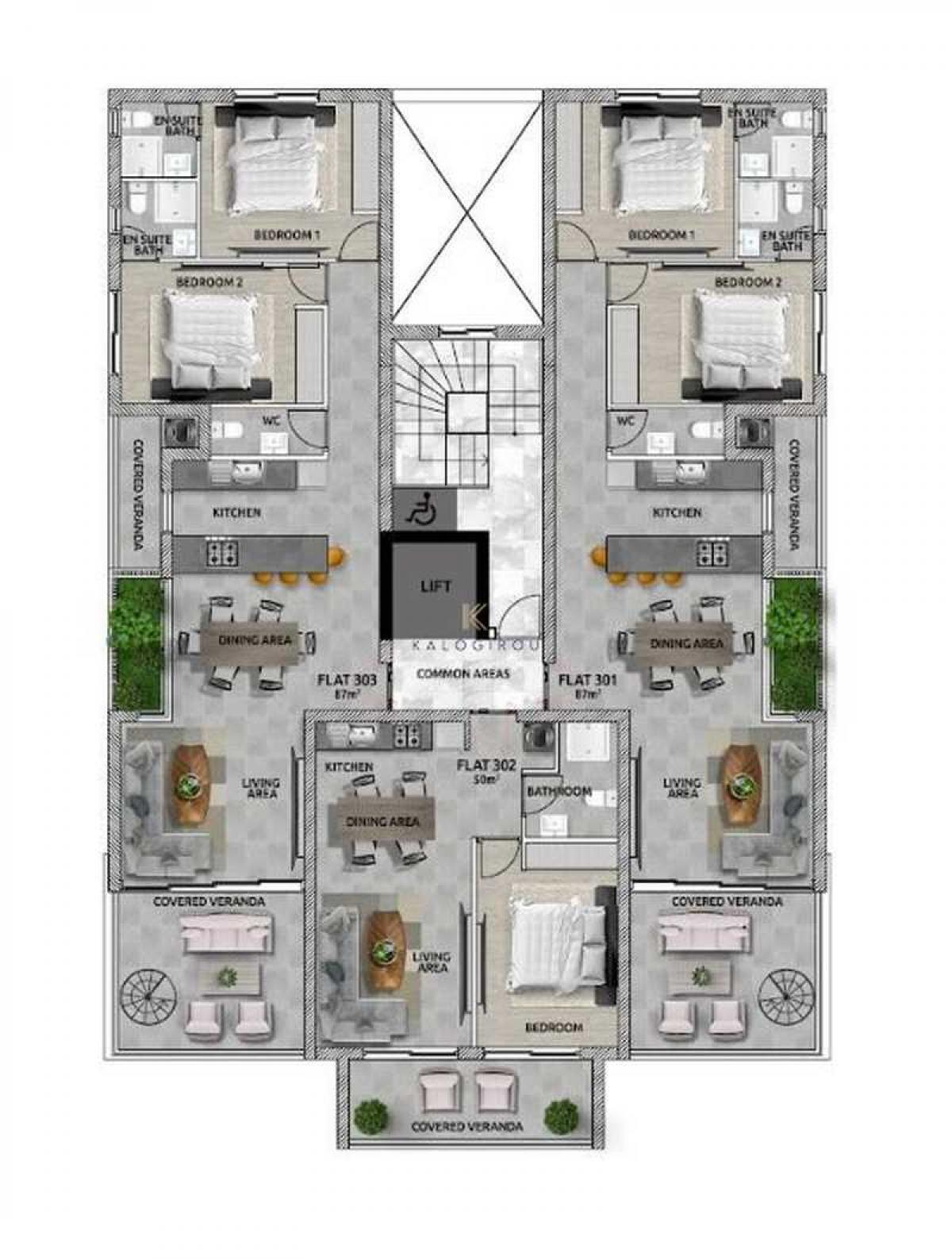 Top Floor, Two Bedroom Flat with Roof Garden in Agios Dometios area, Nicosia. Close to all amenities including, shops, schools, supermakets etc.Top Floor Apartment for sale in Agios Dometios area, in Nicosia. The apartment is on the third floor and has spacious internal covered area of 87 sqm. It consists of an open plan kitchen, living and dining area, a guest wc, two bedrooms, both of them en suite with shower, covered verandas and an amazing roof garden. The roof garden is 55.2 sqm and consists of a siting area, storage and toilet. The residents have access also to a covered parking and storage room on the ground floor.