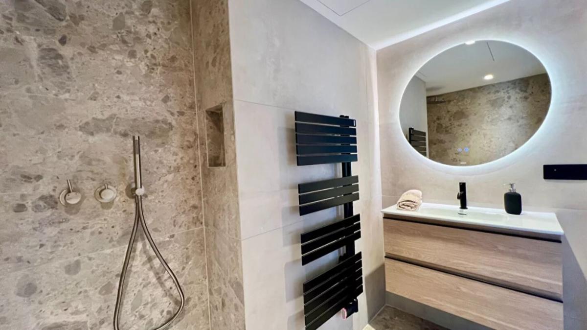 The apartment comprises a spacious 47 m2 living room facing south-east, with a top-of-the-range, fully-equipped kitchen opening onto a large, unoverlooked 40 m2 terrace. Two comfortable bedrooms, including a master suite, plenty of built-in storage space, a shower room with walk-in shower and toilet, and a second independent shower room.