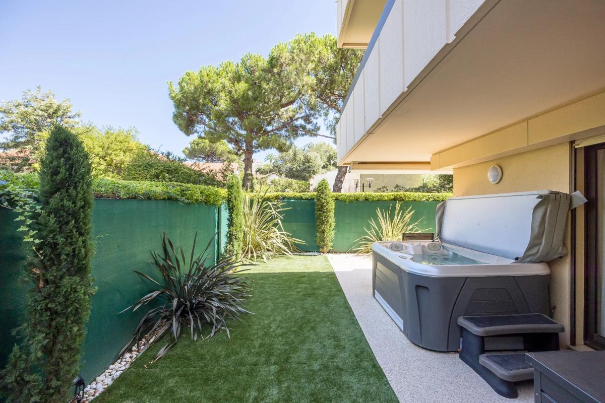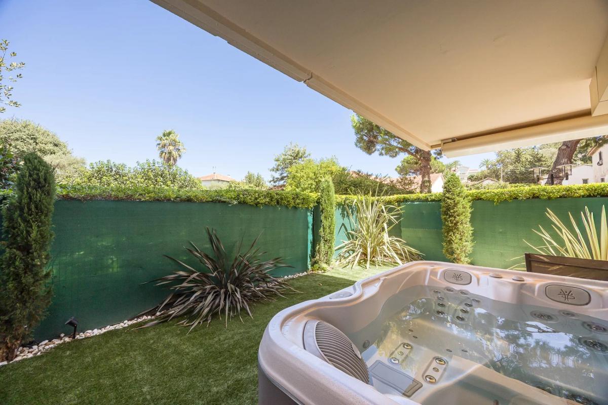 A large deep terrace with jacuzzi, extended by a stunning private 180 m2 garden bathed in sunlight, inviting you to relax in complete privacy