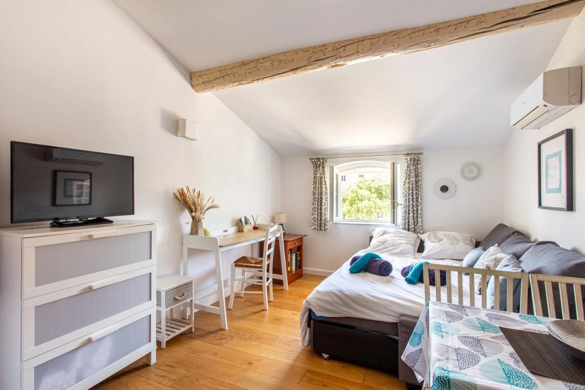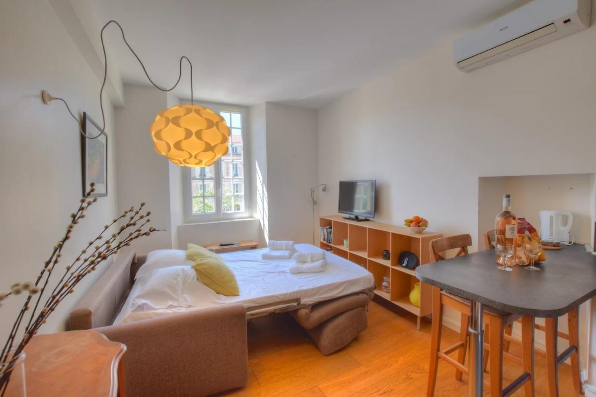 Das vollstandig renovierte Anwesen umfasst funf Studios, eine Zwei-Zimmer-Wohnung und eine Drei-Zimmer-Wohnung. Alle Einheiten verfugen uber moderne Ausstattungen wie Klimaanlage, Doppelverglasung, optimal genutzte Raume und hochwertige Materialien. Sie bieten einen freien Blick auf den Place de la Republique sowie auf die Dacher der Altstadt.