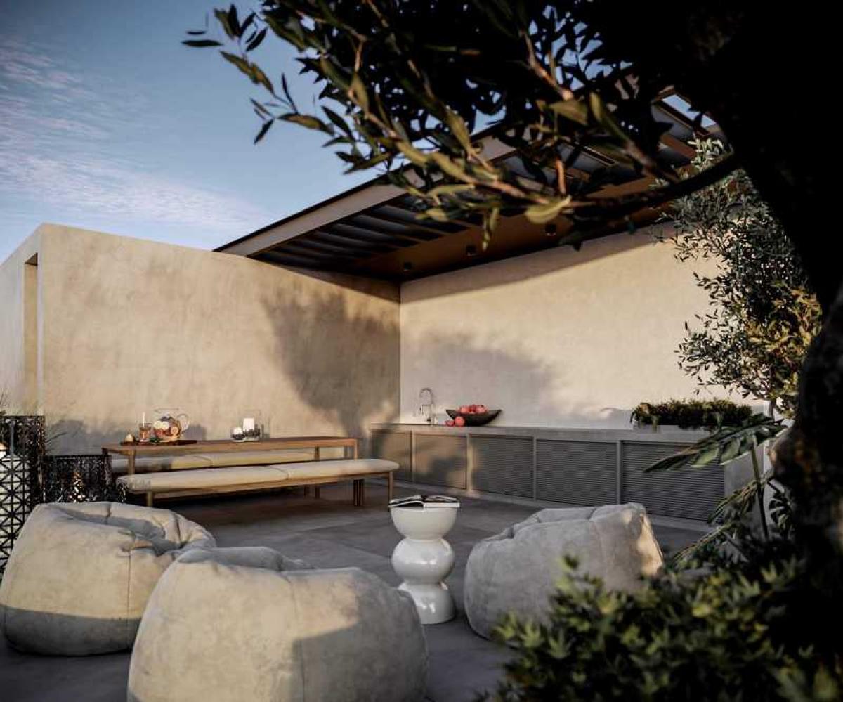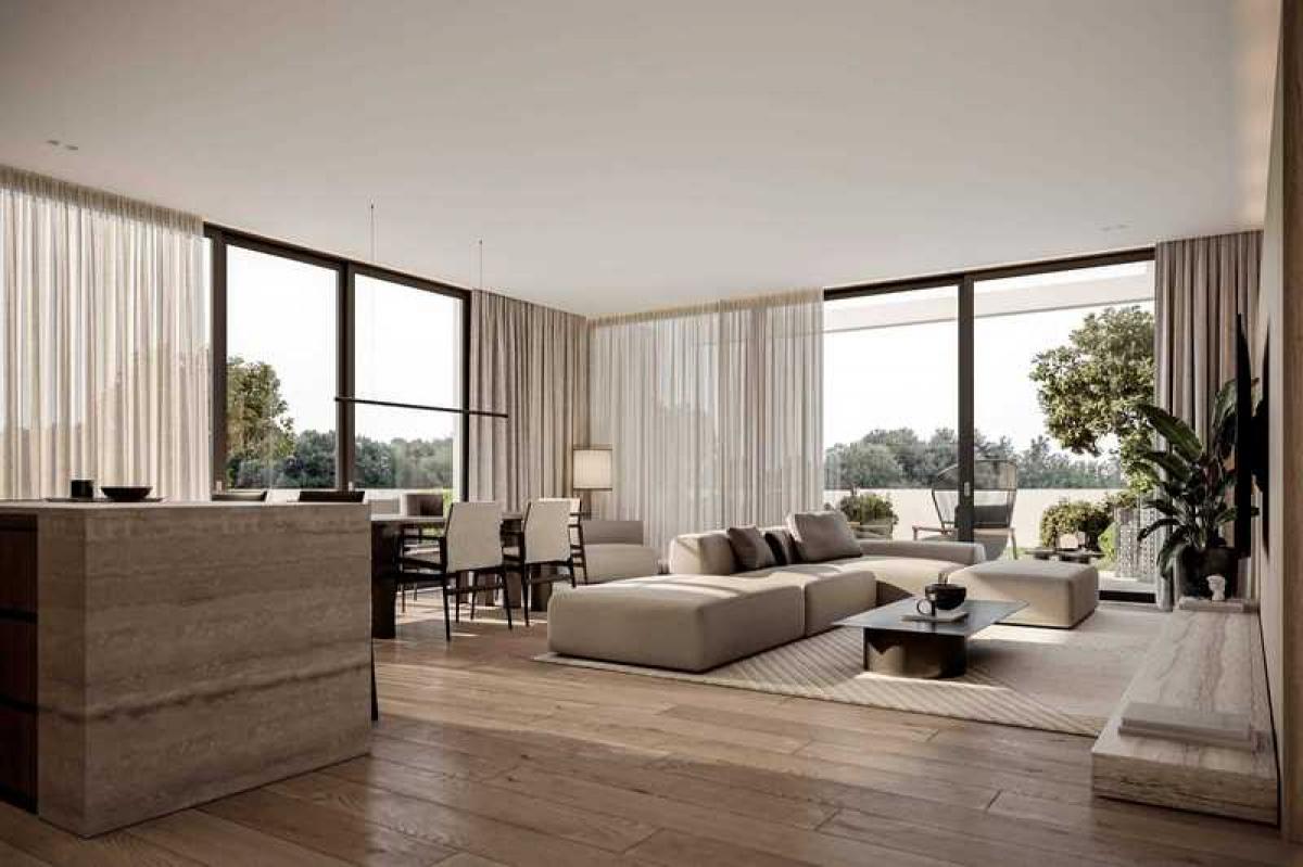 The ground floor has one large home-style 120m2 three bedroom apartment with three bathrooms, lots of closet storage and a large outdoor space of 200m2, with two private parking spots available.