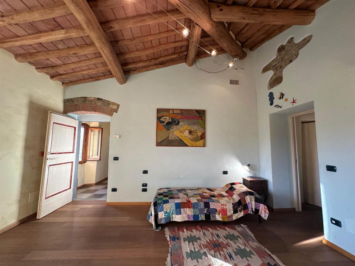 The sprawling garden surrounding the property includes a pool set against the backdrop of gentle Tuscan hills, a barbecue area, and an outdoor kitchen perfect for al fresco dining. The outdoor space provides ample room for relaxation and can comfortably accommodate parking for up to five vehicles. A water spring and solar panels for hot water ensure a sustainable, convenient living experience.