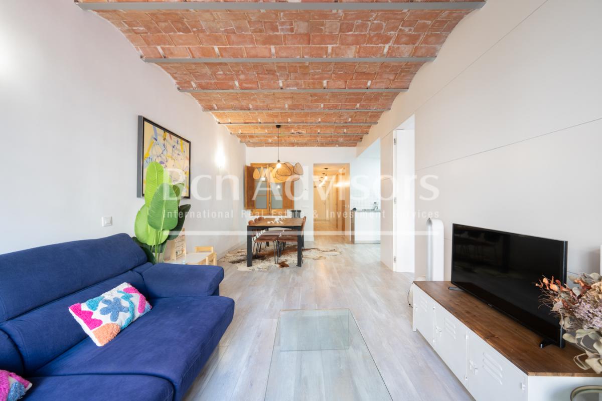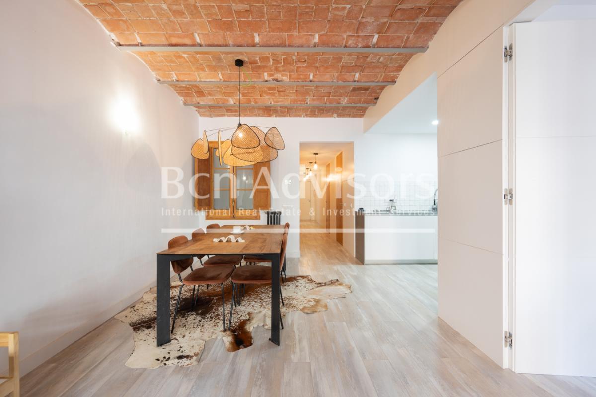 This beautiful flat is located in the upper part of Eixample's right side, just two streets away from Paseo de Gracia and very close to Casa de les Punxes, Avenida Diagonal and the Gracia neighbourhood. It is an enviable location where you can enjoy neighbourhood shops, top brand boutiques, all the necessary services, cafes and restaurants, leisure activities and many public transport options.The property was recently renovated with high-quality materials and finishings and is in perfect condition. It stands out for its original features such as high ceilings with Catalan vaulting, restored exposed brick walls and restored original woodwork. It is on the first floor of a classic building with a lift. It enjoys plenty of natural light and is very quiet, as it overlooks the inner courtyard.