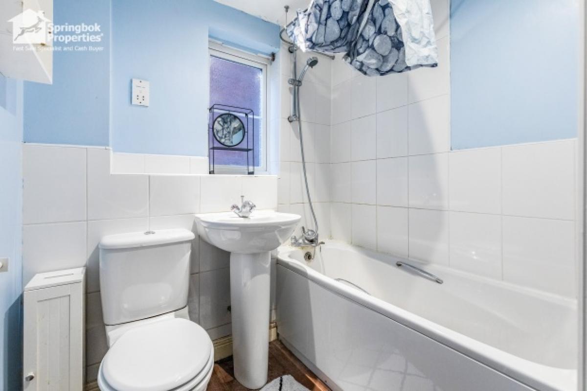The three-piece family bathroom is clean and functional, featuring a full-sized bath with overhead shower, pedestal sink, and WC, complemented by a window for ventilation and natural light.