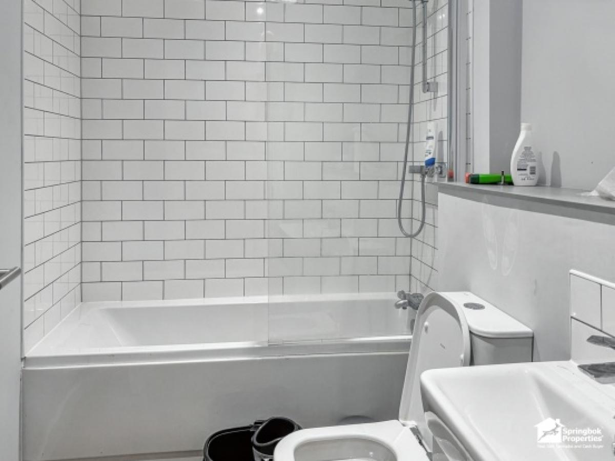 The sleeping area is well-proportioned with large windows, and the bathroom features contemporary fittings, shower over bath and heated towel rail.