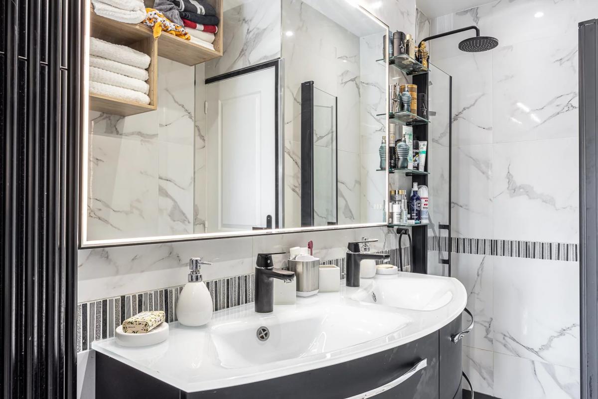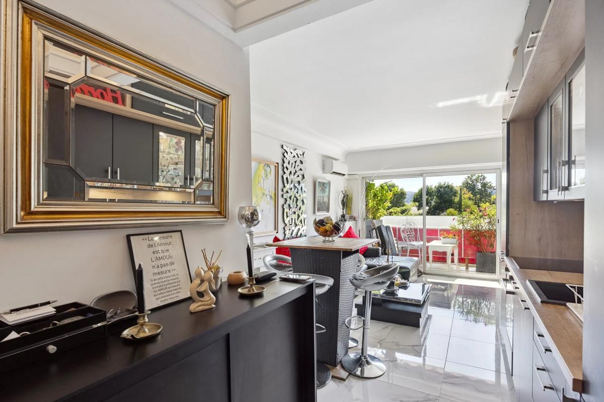 The living room opens onto a south-west-facing terrace of around 11 sqm, with an uninterrupted view over the Hippodrome and a superb sea view as far as Cap d'Antibes. With its soft ambience, functional layout and omnipresent natural light, this flat combines aesthetics with modern comfort.
