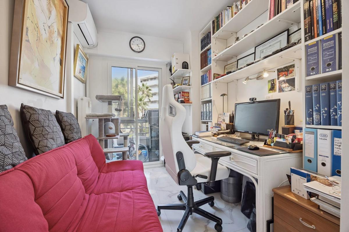 Der Wohnbereich offnet sich zu einer ca. 11 m2 grossen Terrasse in Sudwestlage mit freiem Blick auf das Hippodrom und einem herrlichen Blick auf das Meer bis hin zum Cap d'Antibes. Sanfte Atmosphare, funktionelle Aufteilung, allgegenwartiges naturliches Licht: Die Wohnung verbindet Ästhetik mit modernem Komfort.