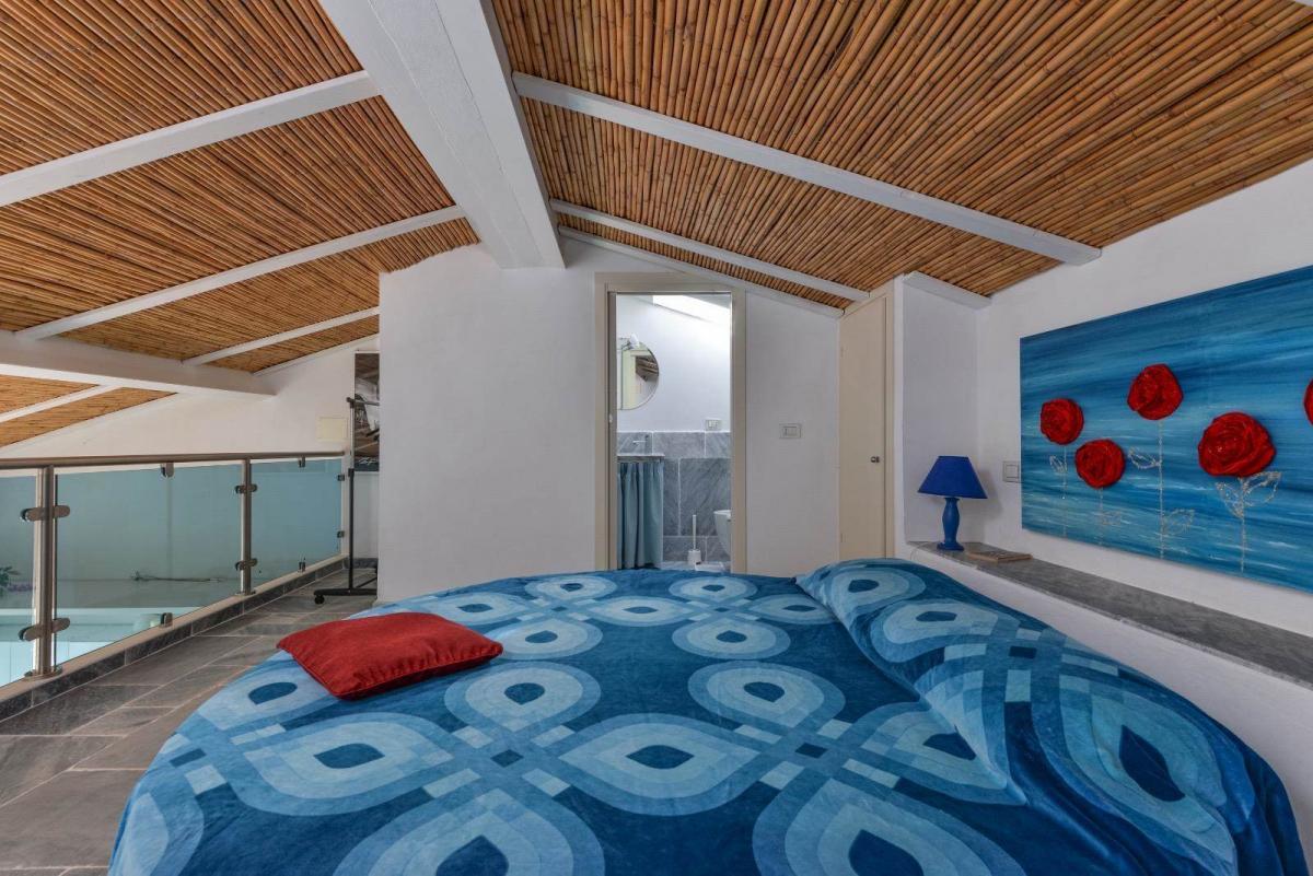 The apartment features a spacious living room with open kitchen and comfortable sofa, a bedroom with two single beds, three modern bathrooms, and a charming loft with a round bed, perfect as a relaxation area or additional bedroom. Air conditioning ensures maximum comfort in every season.