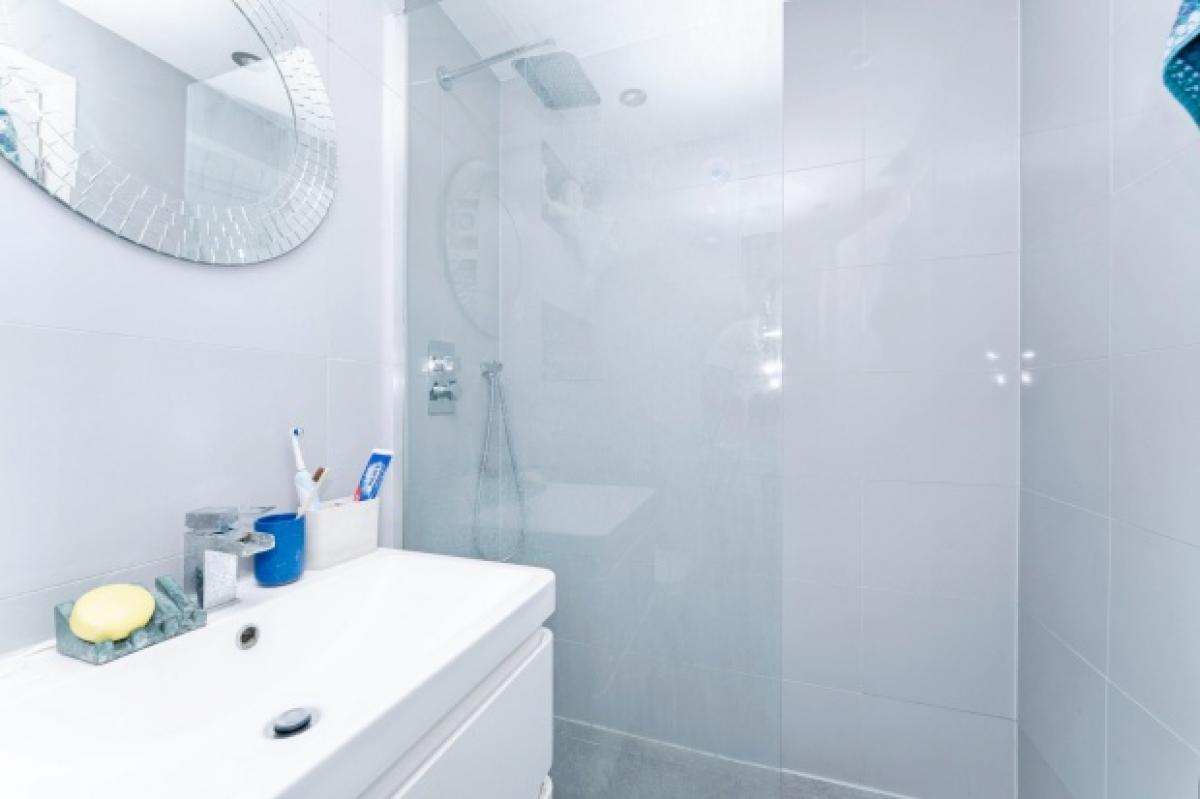 A generously proportioned double bedroom benefits from Oak flooring, calm neutral tones, and garden-facing views, making it a restful and private retreat. Adjacent is a sleek, modern shower room complete with a rainfall showerhead, vanity basin and large format wall tiling, offering both style and function.