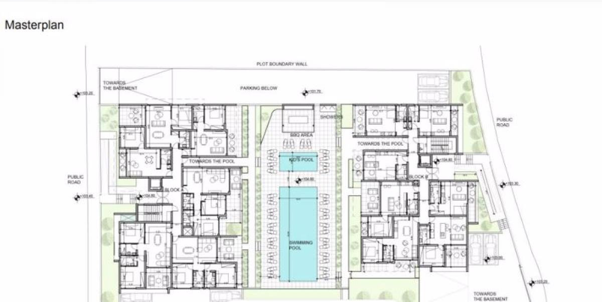 Nestled between the blocks is a tranquil swimming pool, creating a central oasis for relaxation. Enjoy the refreshing waters or watch your little ones play in their dedicated kid's pool, surrounded by the beauty of nature.