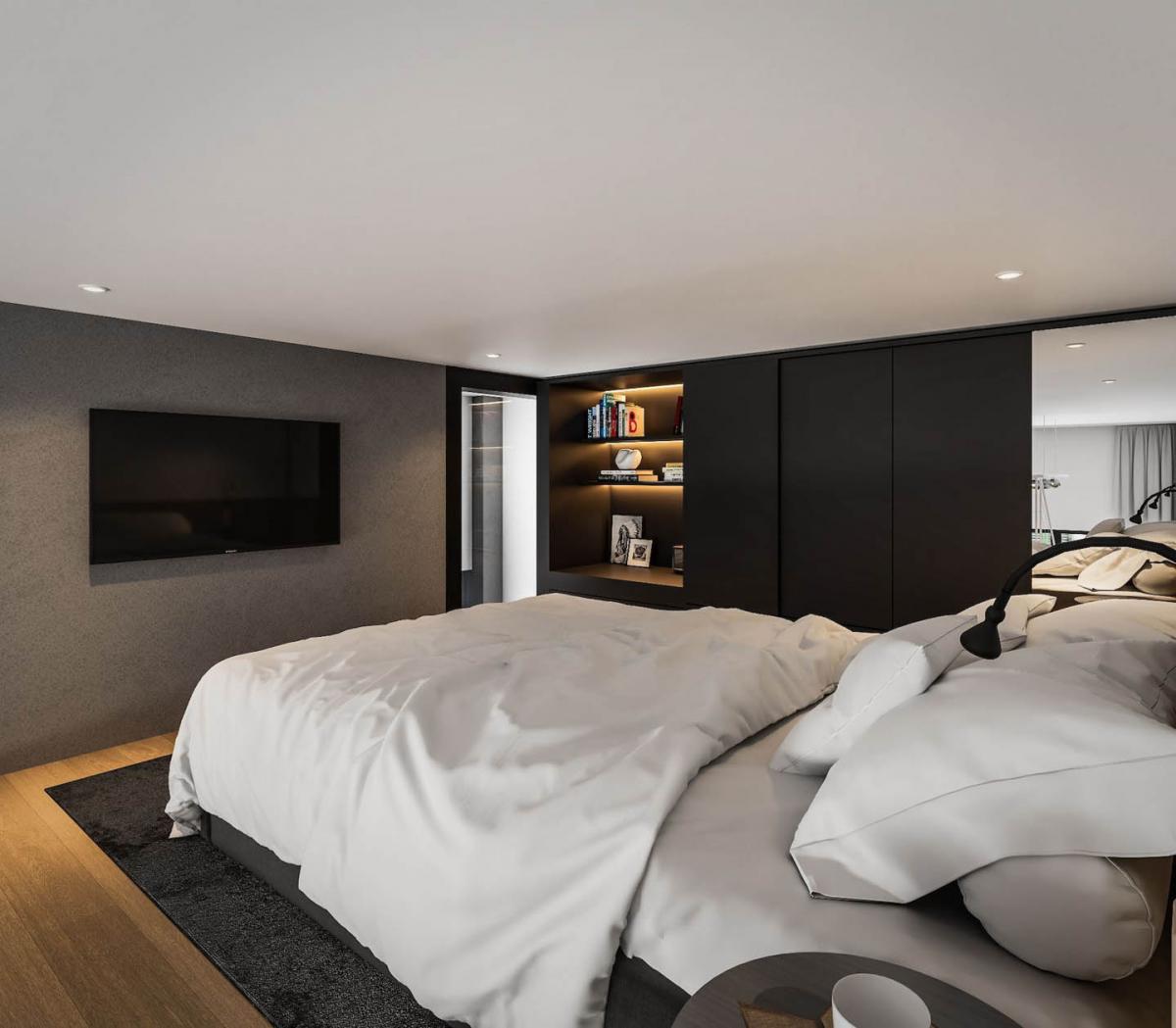 A podium-style bedroom on the mezzanine remains visually discreet yet fully integrated into the composition. Two modern bathrooms with urban-inspired dark accents elevate function into an aesthetic gesture. Split-unit air conditioning, concealed wiring for heating and alarm systems, underfloor heating provisions—this home is engineered for those who appreciate comfort even when it's invisible.