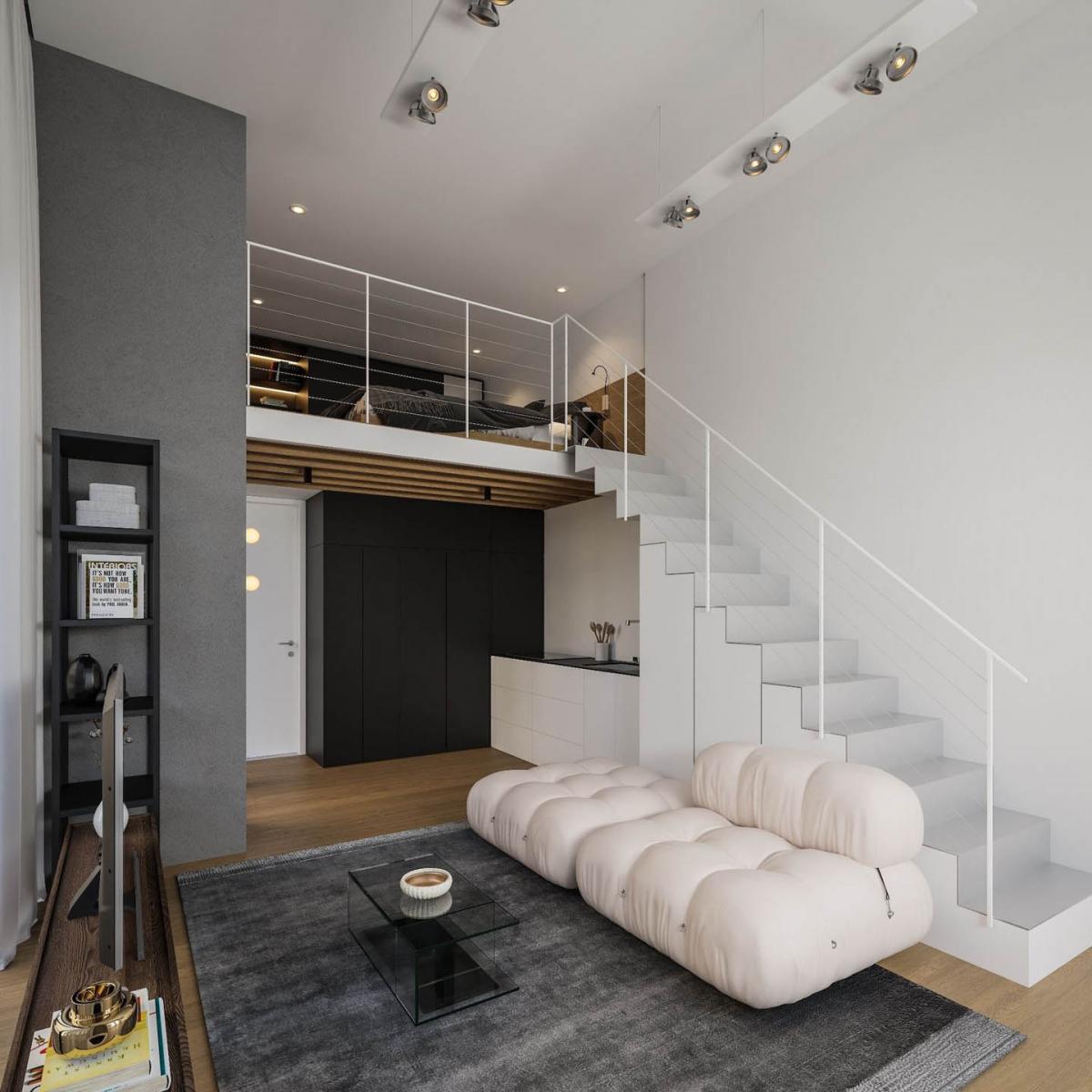 Inside, the space opens before you like a stage set. High ceilings and full-height windows amplify volume, and light dances across sheer curtains like a verse in the city's ongoing poem. A sophisticated minimalist style connects the open kitchen, living room, and mezzanine sleeping area into a cohesive, fluid whole. Every detail—from the sculpted sofa to the tonal wall accents—is meticulously considered for genuine comfort, the kind that doesn't shout, but settles in quietly and stays.
