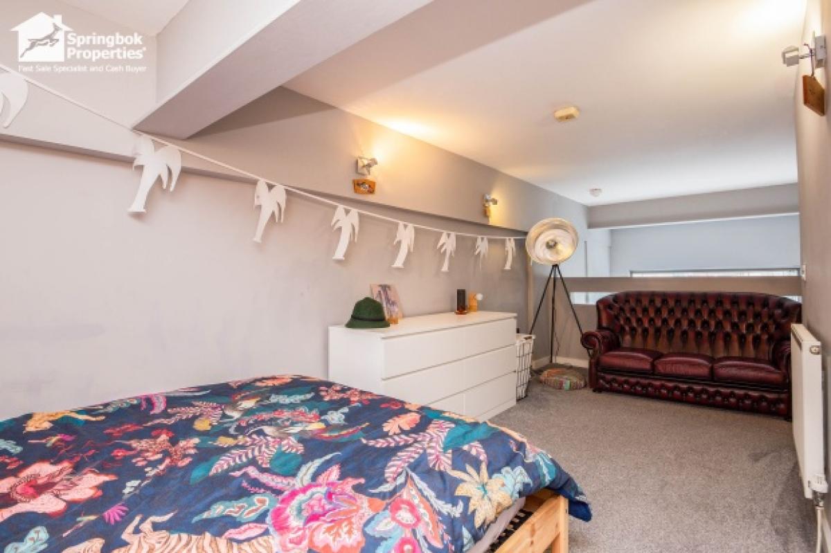 A staircase ascends to a tranquil mezzanine level, where the main bedroom benefits from a vantage point overlooking the living area below. It's capacious enough to accommodate a double bed, a separate sofa or armchair, and wardrobe storage. A second bedroom or guest room completes the layout, offering flexibility for home working, overnight guests or a peaceful retreat.