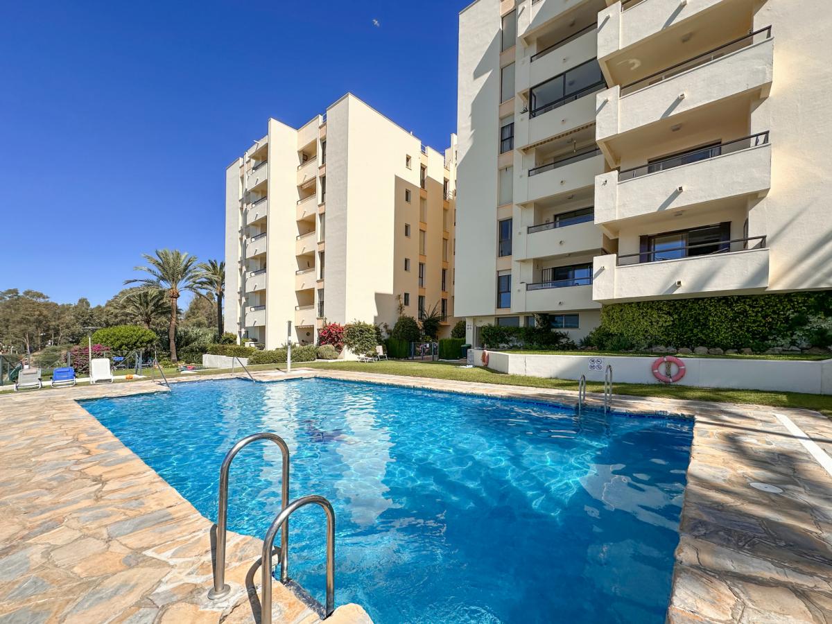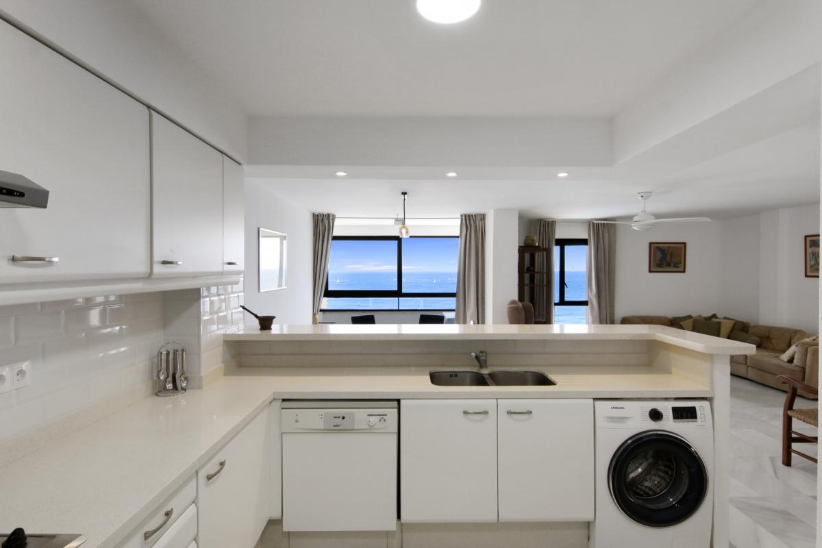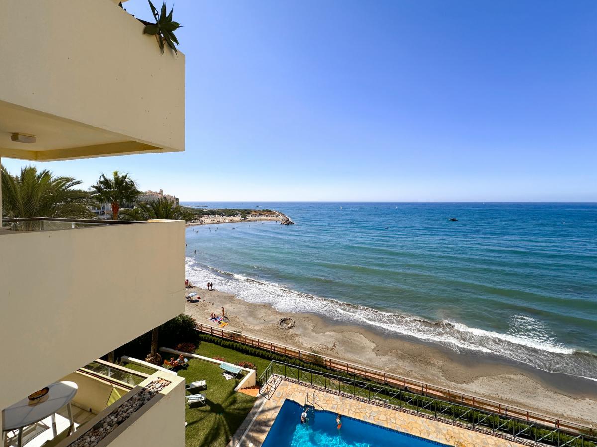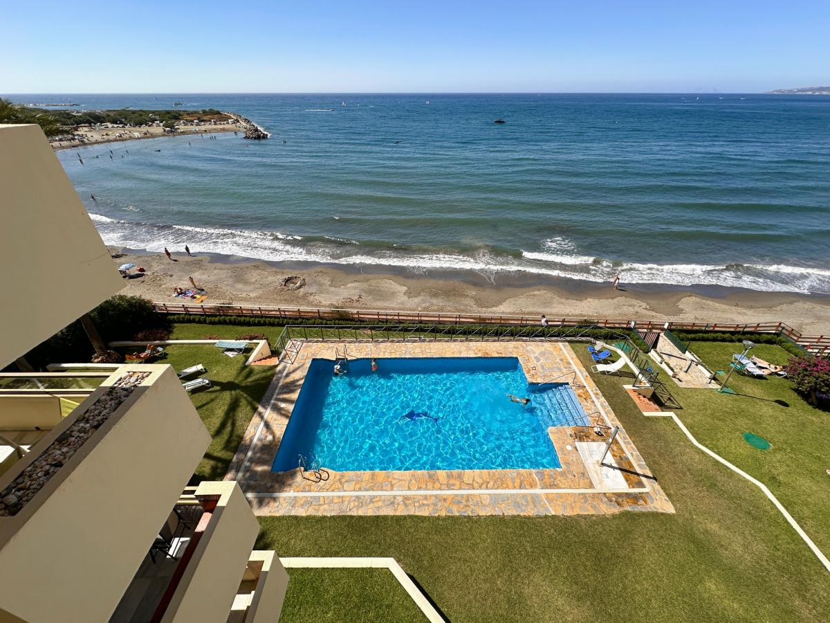 Welcome to this spacious third-floor apartment, perfectly positioned in one of Esteponas most desirable and established beachfront communitiesVeramar. With spectacular front-line views across the Mediterranean to Gibraltar and even Morocco on most days, this is a rare opportunity to own a prime coastal property just steps from the port and Playa del Cristo.From the moment you enter, a welcoming foyer connects you to the heart of the home. To the left, an expansive open-plan kitchen flows seamlessly into the dining and living areas, where a large covered terrace invites you to soak in the sweeping sea views. The bright and airy living room is further enhanced by additional windows framing the coastline.A hallway leads to the private sleeping quarters, where you'll find a spacious master suite complete with its own bathroom and generous dressing room. A second bedroom is served by a full guest bathroom just across the hall. The flexible layout of this apartment allows for the easy addition of a third bedroom, offering great potential for customisation.This home also includes a private underground parking space and enjoys the security of a 24-hour gated complex. Veramars beautifully maintained gardens and beachfront pool provide the ultimate in relaxation, while direct access to the seaside promenade makes walking to the marina or beach effortless.With top-tier golf courses, shopping, Marbella just 20 minutes away, and Malaga airport under an hours drive, this is coastal living at its bestwhether for full-time residence or as a luxurious holiday escape.