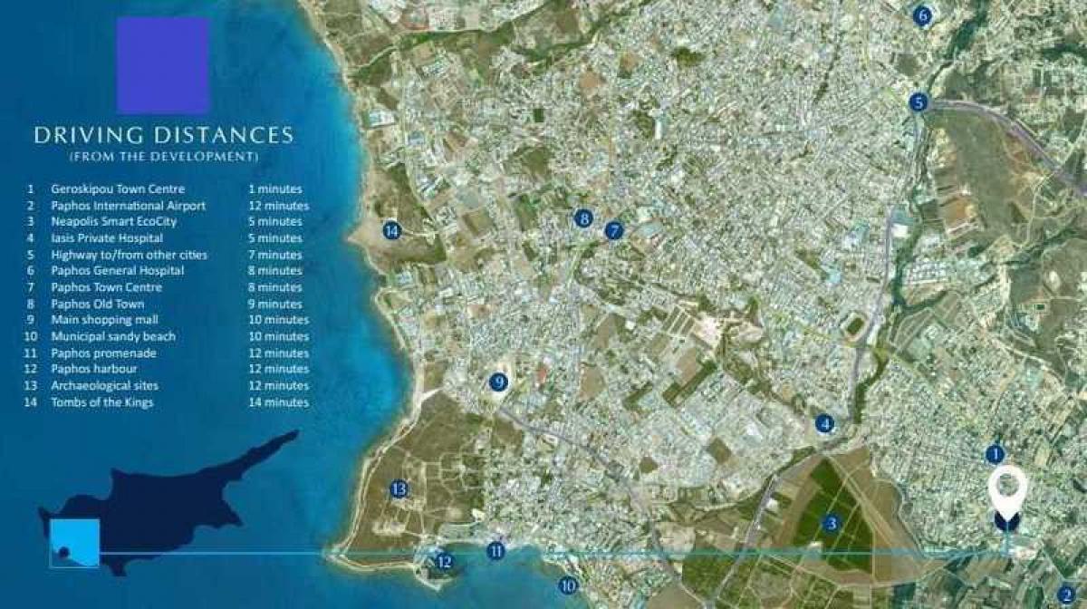 This apartment is ideal for either a permanent residence, holiday home, or simply an appreciating asset. Set on a hillside not far from Geroskipou's main square and the ancient spring, the property enjoys views of the fertile plains of Geroskipou and the Mediterranean Sea.Apartments occupiers have access to use the two large communal swimming pools and additional external features such as beautiful gardens, large sun terraces and stone paving. Interiors are based on the concept of open and light-filled living spaces. Amenities such as communal swimming pools, covered parking, a restaurant, a bar, and a mini-market are just some of the project's conveniences.