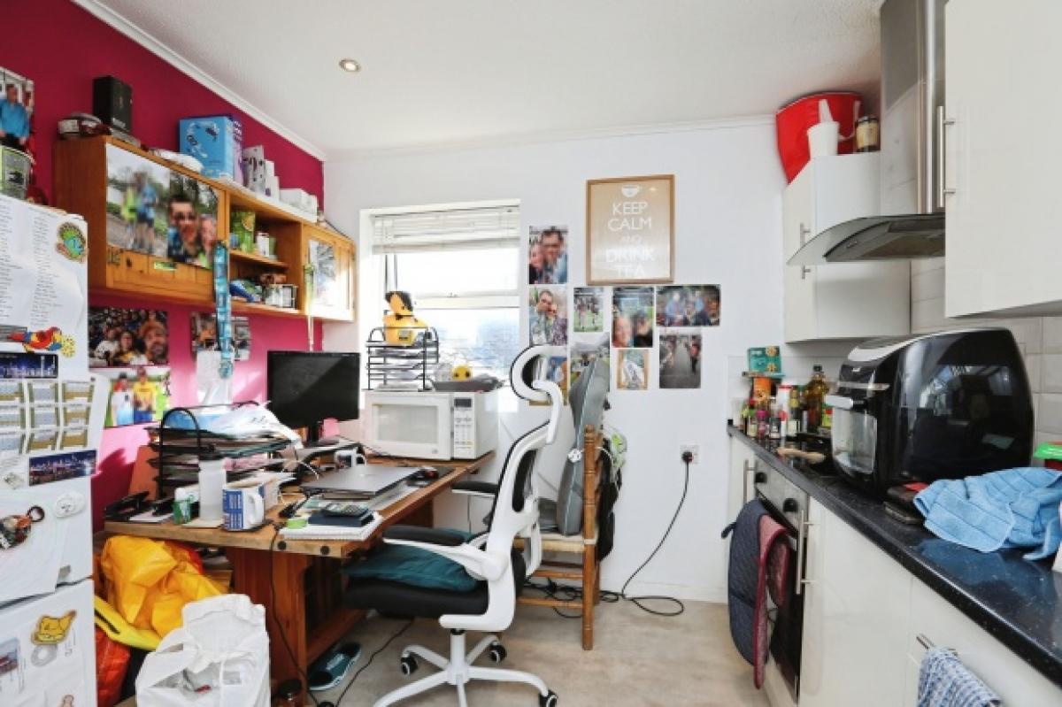The kitchen/diner is a real highlight, fitted with a range of contemporary wall and base units, marble-effect work surfaces, and a stylish electric oven and hob with extractor hood. With ample room for a dining table and chairs, this space is perfect for relaxed meals or entertaining. Two double-glazed windows overlook the communal gardens, filling the room with natural light.