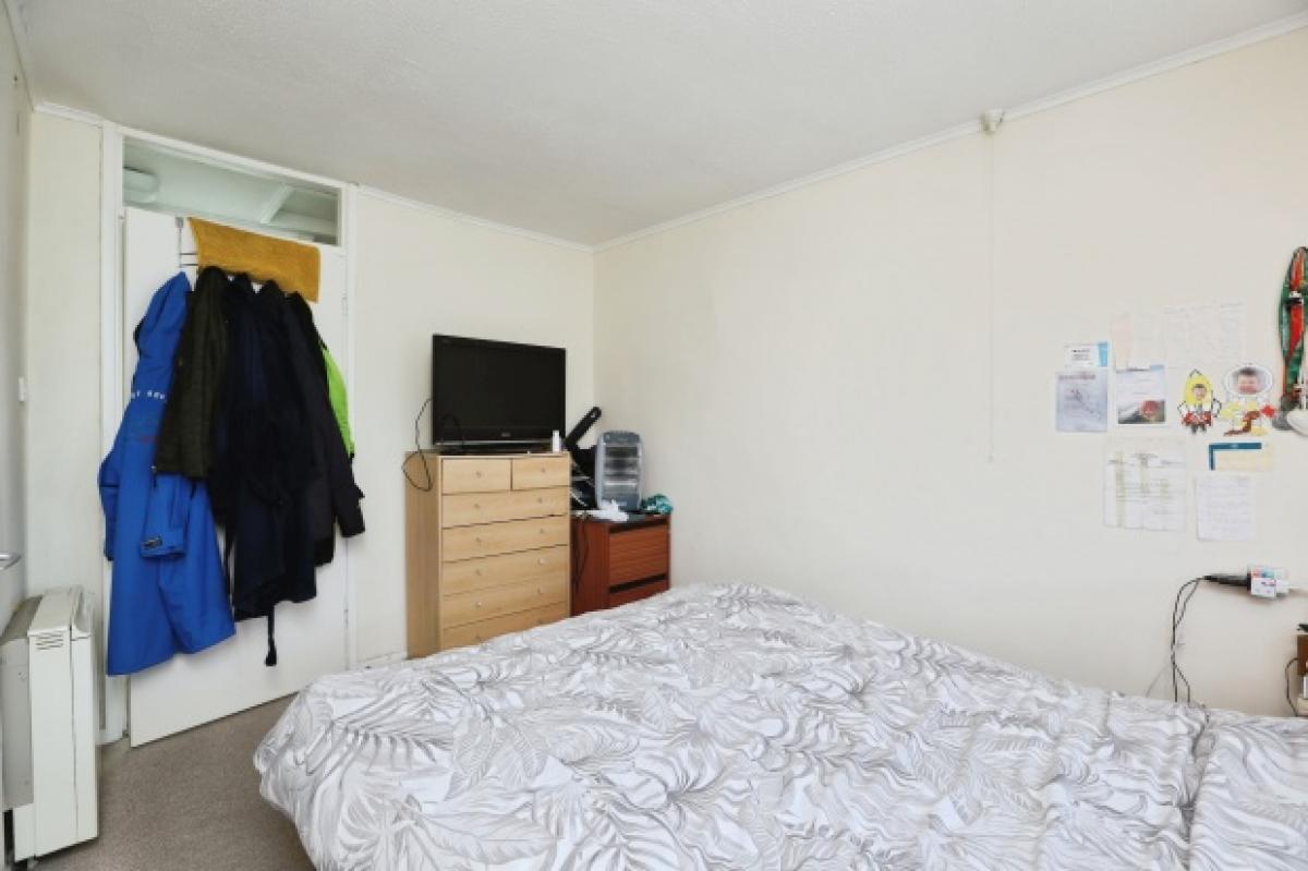The double bedroom is well-proportioned and benefits from fitted storage, while the bathroom is fitted with a modern three-piece suite including a bath with shower over, vanity sink unit, WC, heated towel rail, and tiled walls for a fresh finish.