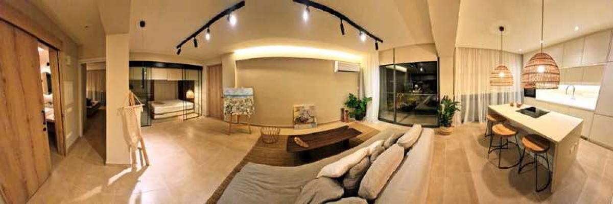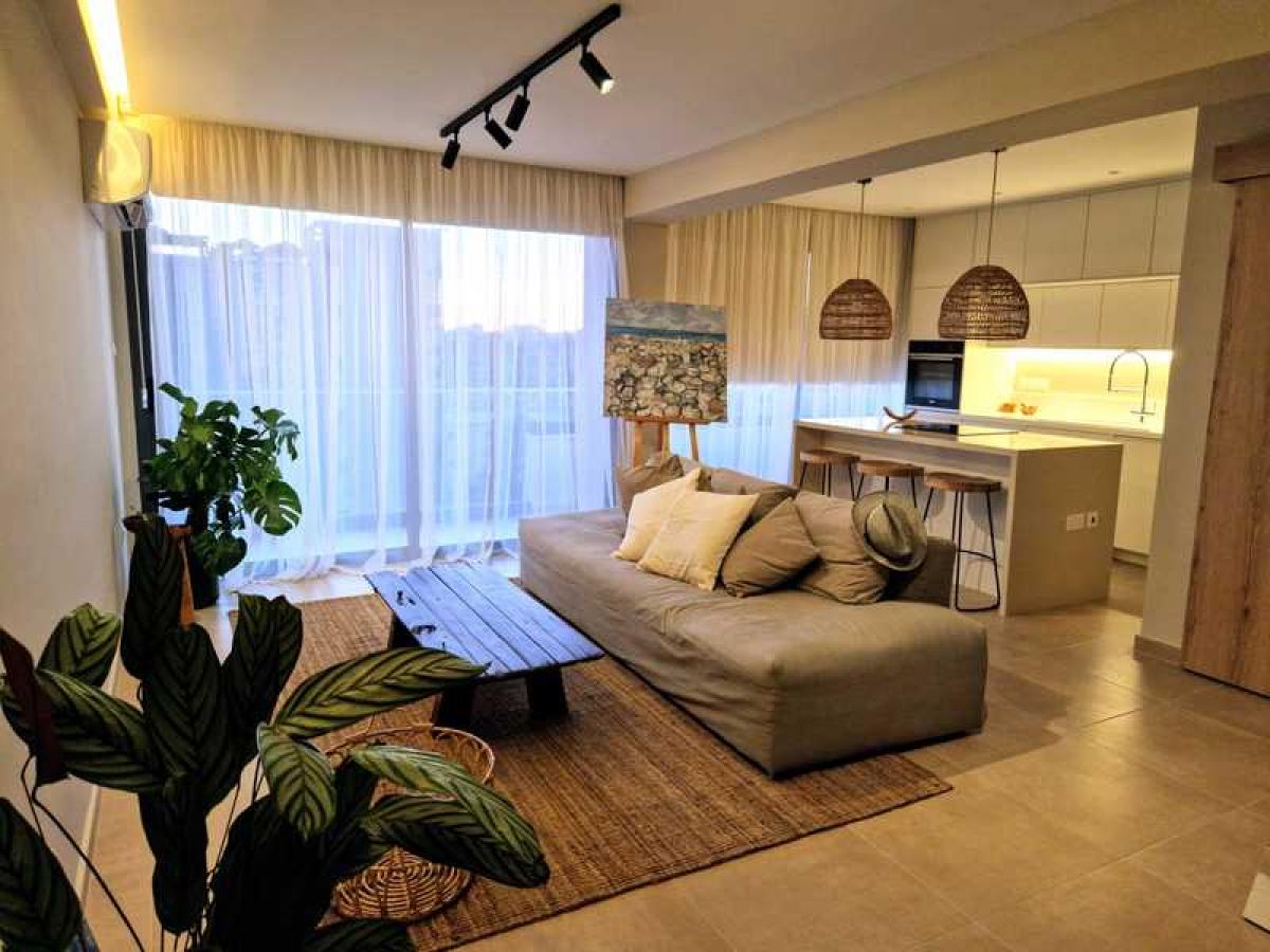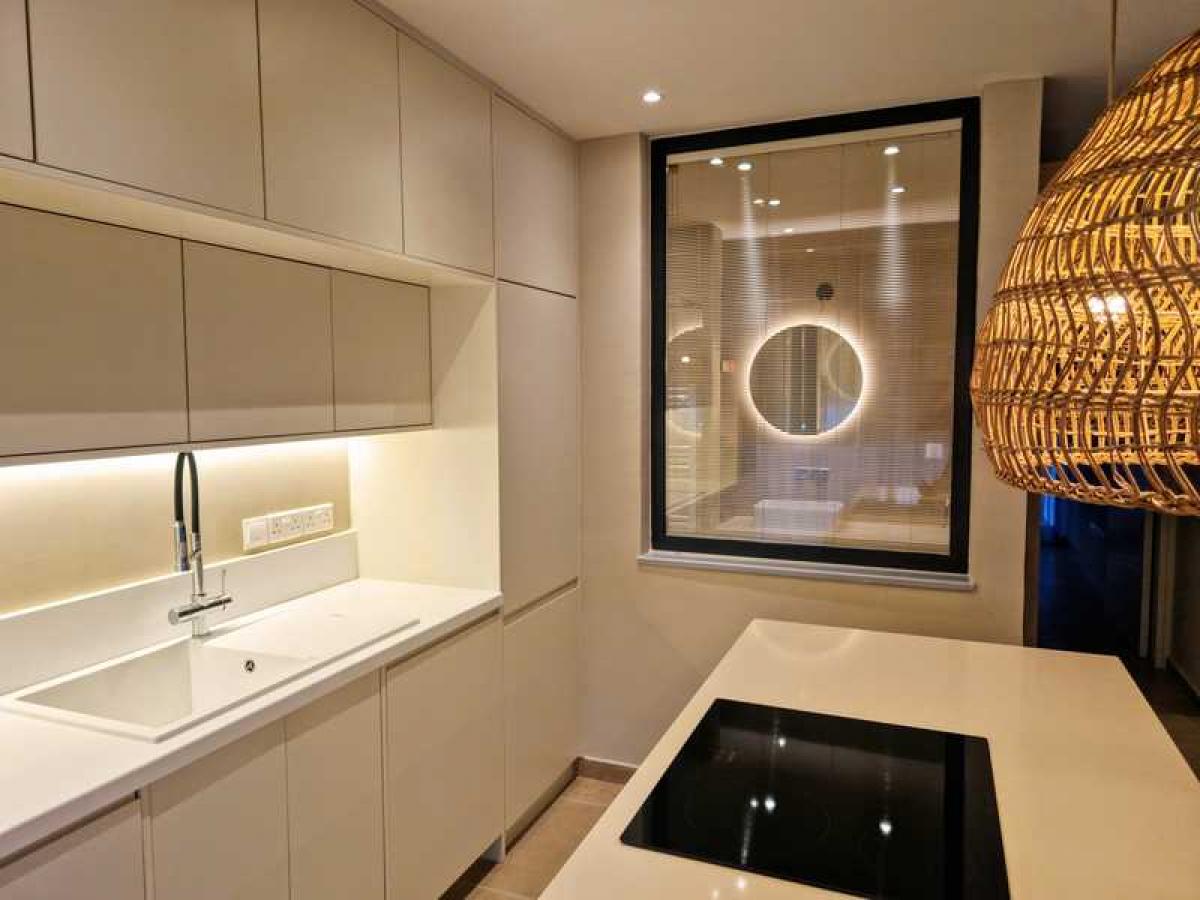This warm and tastefully fully furnished apartment offers a large balcony and open plan kitchen/living room space with a natural color tone design giving you fantastic views of the sea by day and a beautifully lit city by night. This stunning apartment was designed to bring as much light in as possible, while also making the views of the sea its key focal point from all corners of the apartment. The bathroom was also especially designed to have a practical and convenient space with a large interior window for you to enjoy the sea views while you shower and also have the option for privacy with an interior blind in the window frame.