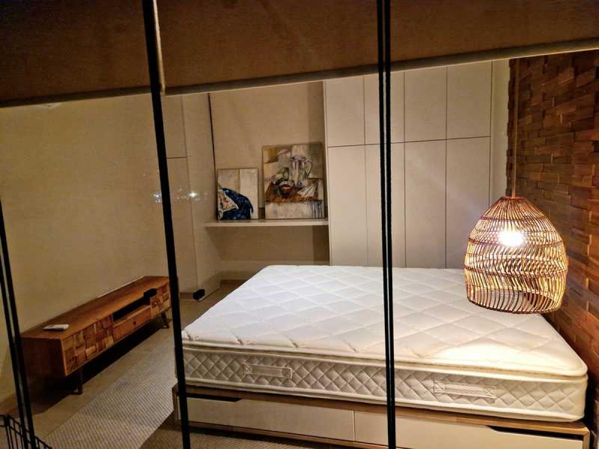 - 1st Bedroom/Office with Wood Wall Art and Glass Sliding Doors and Blinds for privacy, built-in wardrobes and vanity, double bed, TV unit, carpet, night stand and rattan pendant light.