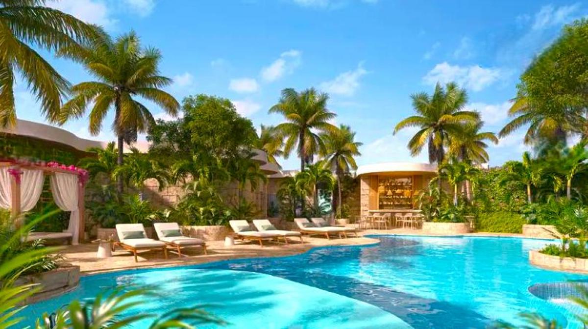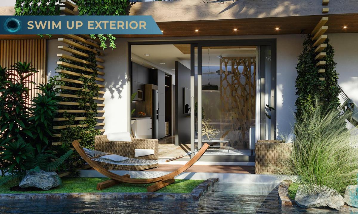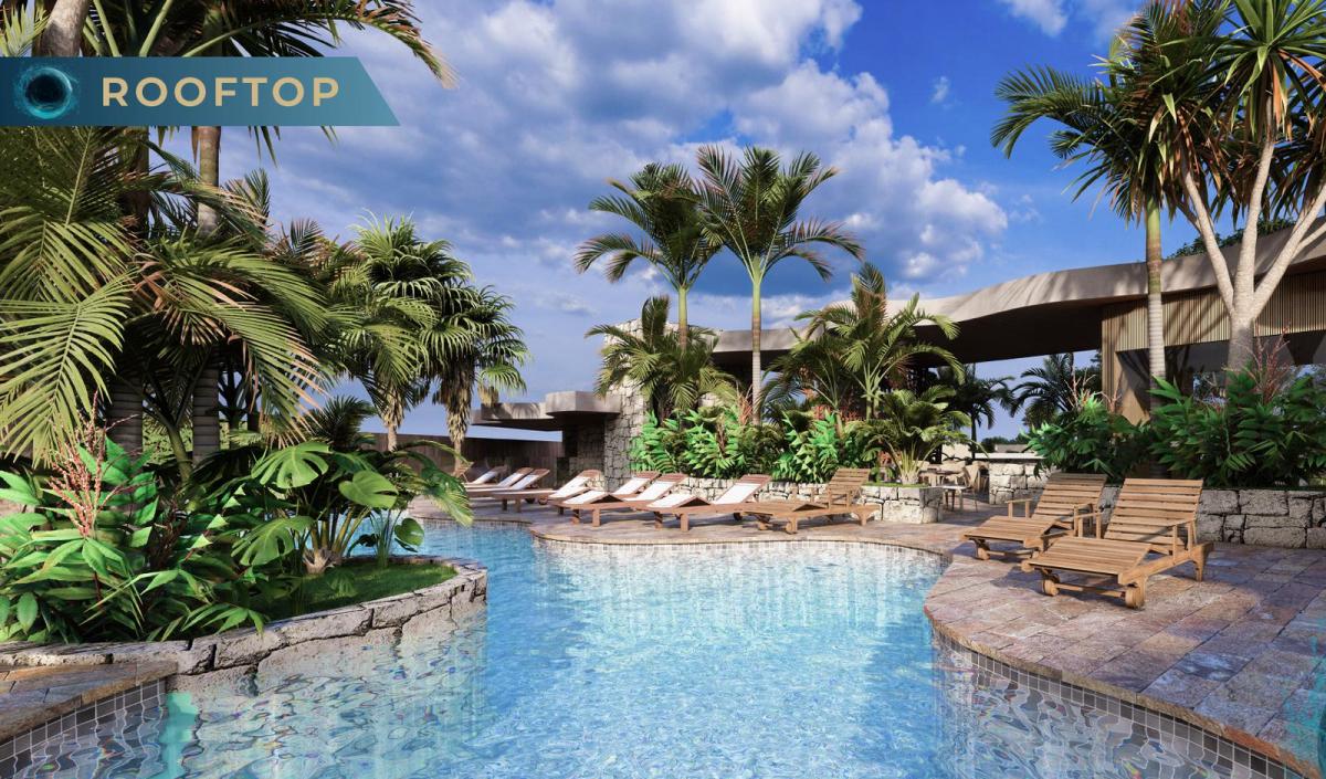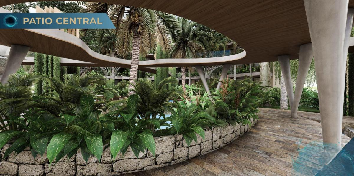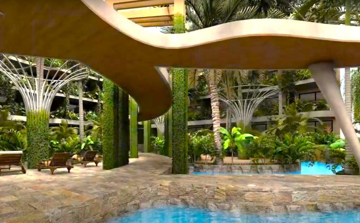 that mimic the sacred cenotes of the region, therapeutic waterfalls that gently