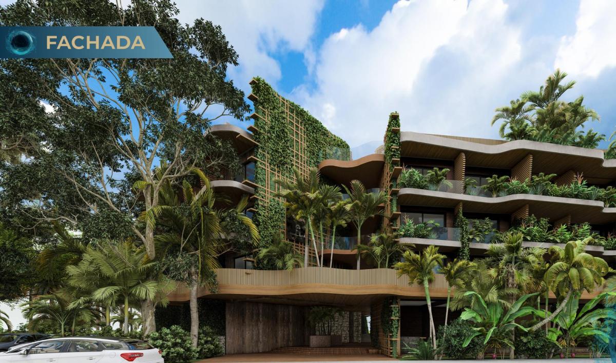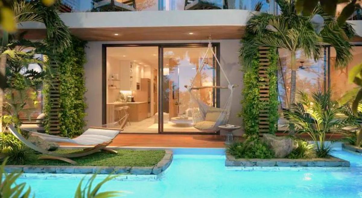 The residences, built with native materials like zapote wood and coral stone, feature high ceilings and spacious terraces maximizing connection with nature.