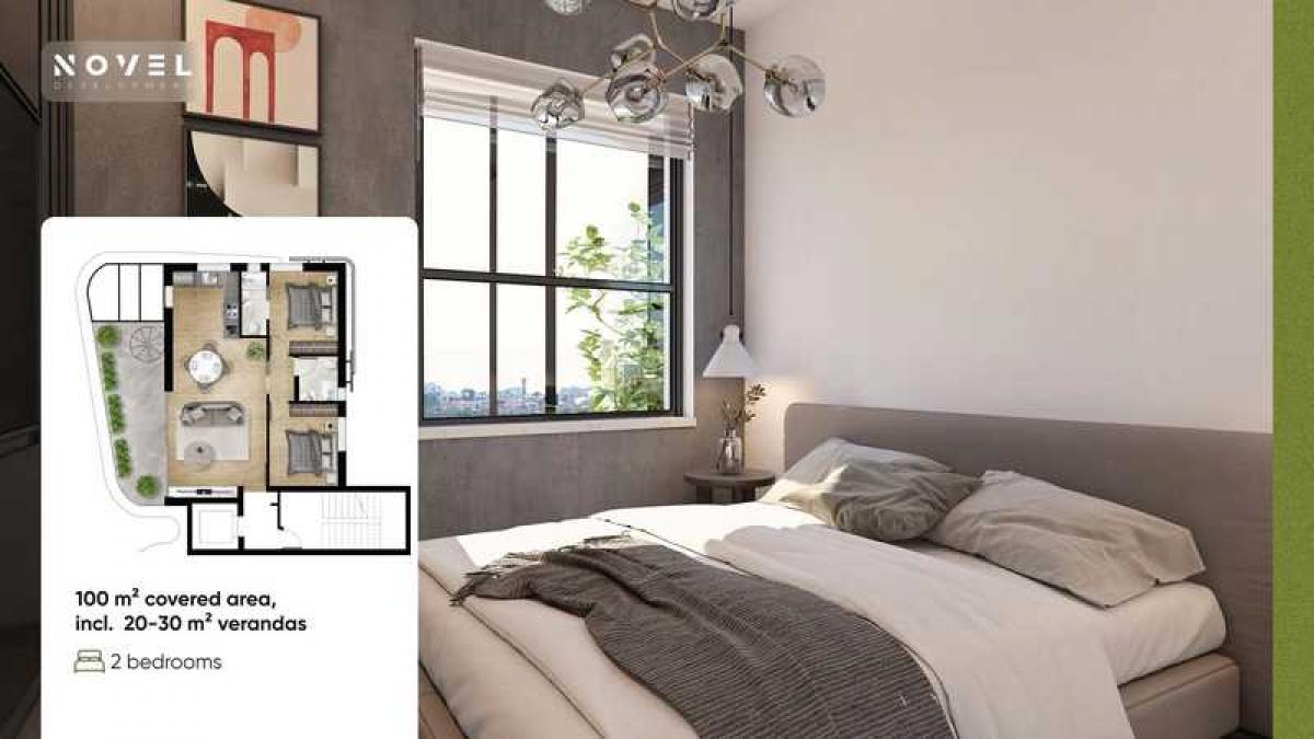 Luxury urban lifestyle penthouse in 5 floor residential complex of 33 apartments (3 blocks) with swimming pool in common area is for sale at the construction stage from Novel Development.Includes, covered veranda 20 m2, roof garden 23 m2, covered parking and storage room with a total area of 122m2. Perfect solution as for locals as for permanent residence permit.