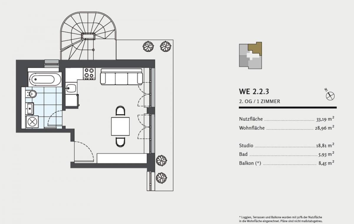 This spacious apartment offers approx. 29m2 of living space and consists of a living-room combined with an open-plan kitchen giving access to a large wrap-around balcony and a modern bathroom with a bathtub.