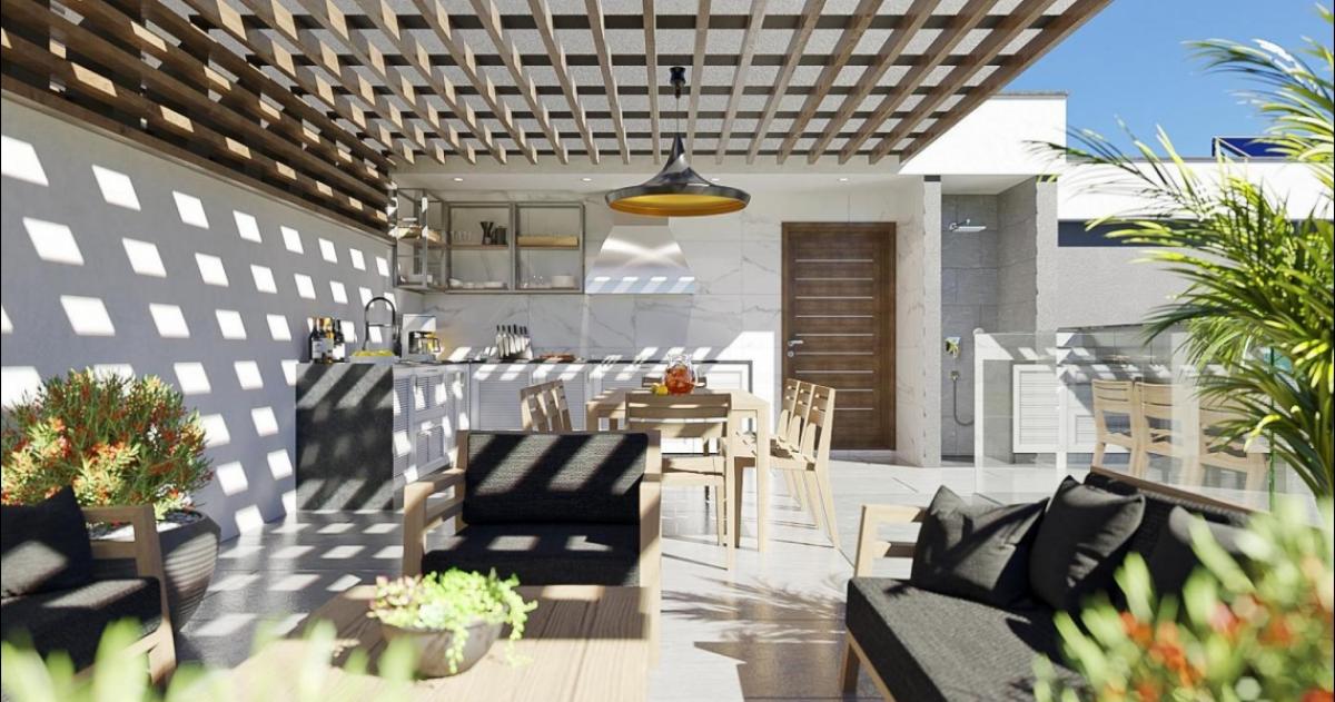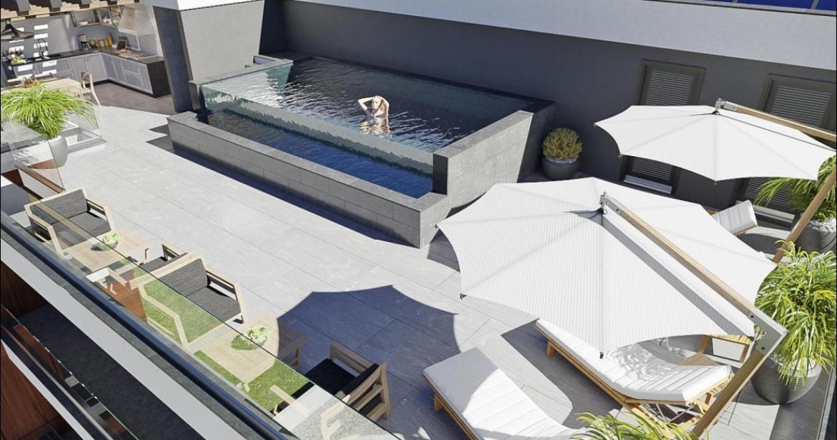 On each floor there are separate apartments with a total areas of 70, 123, 165 and 314 square meters, and the biggest penthouse located on the top floor offers a living indoor area of 158 square meters + equipped rooftop terrace with a pool and sea views is 182 square meters. All apartments have storage rooms.