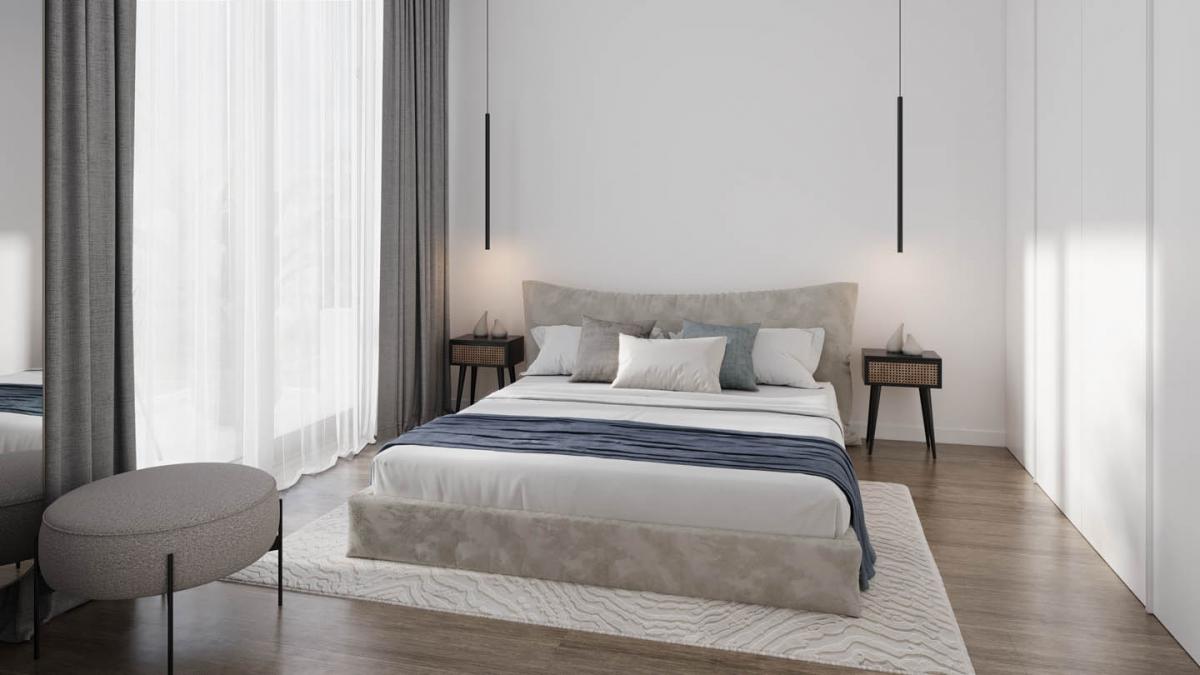The bedroom is fitted with floor-to-ceiling wardrobes, providing ample storage space while maintaining the apartment's clean and minimalist aesthetic.