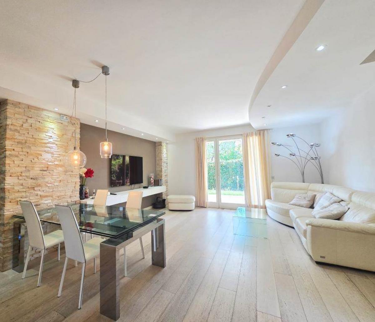 The entrance opens into a large, bright living room with direct access to the private garden, featuring a paved area ideal for outdoor relaxation.